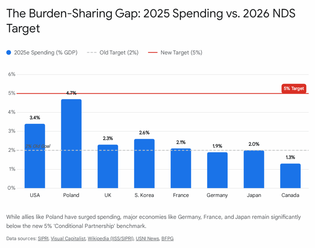 The 2026 NDS fundamentally rewrites the social contract of American alliances. The era of unconditional security guarantees is over; the era of “Conditional Partnership” has begun. The strategy posits that for too long, U.S. allies have “free-ridden” on American protection, allowing their own defenses to atrophy while the U.S. bore the cost.10