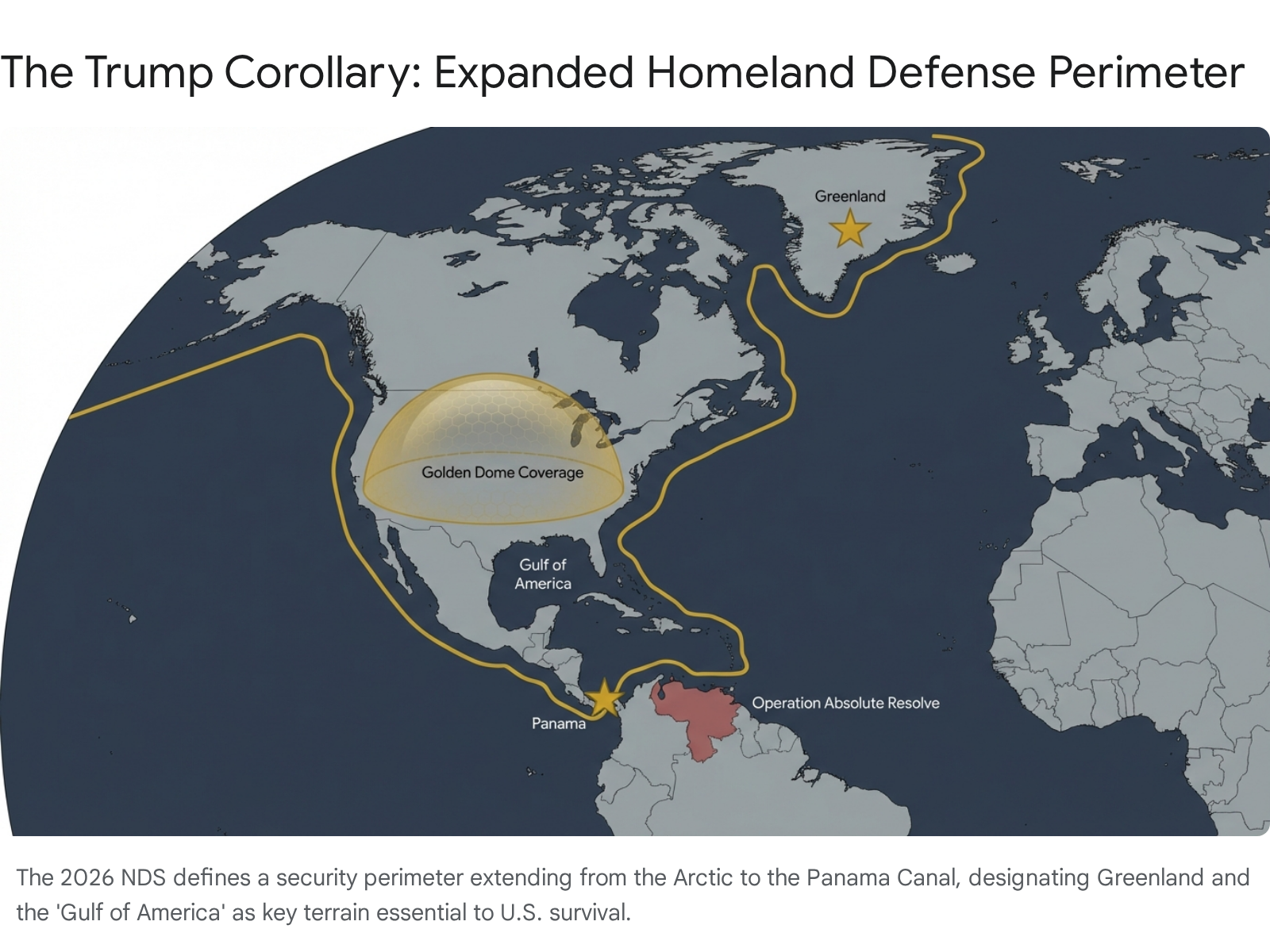 The defining feature of the 2026 NDS is the elevation of Homeland Defense from a supporting function to the absolute strategic imperative. Unlike previous strategies that viewed forward deployment as the primary means of defending the homeland (“fighting them over there so we don’t fight them here”), the 2026 NDS assumes that in a modern conflict with peer adversaries, the homeland will be a primary target of kinetic and non-kinetic attacks. Consequently, the strategy redefines the “Homeland” to encompass a strategic sphere of influence extending from the Arctic to the Panama Canal.