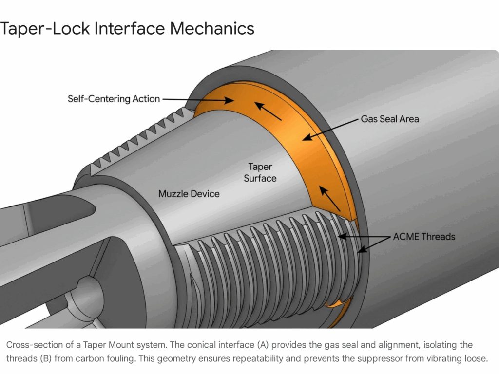 - Gas Seal: The large contact area of the taper creates a gas-tight seal that prevents carbon fouling from reaching the threads. This is critical for preventing “carbon lock,” where the suppressor becomes fused to the mount.43