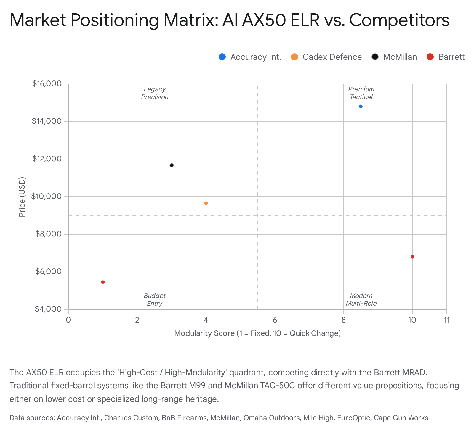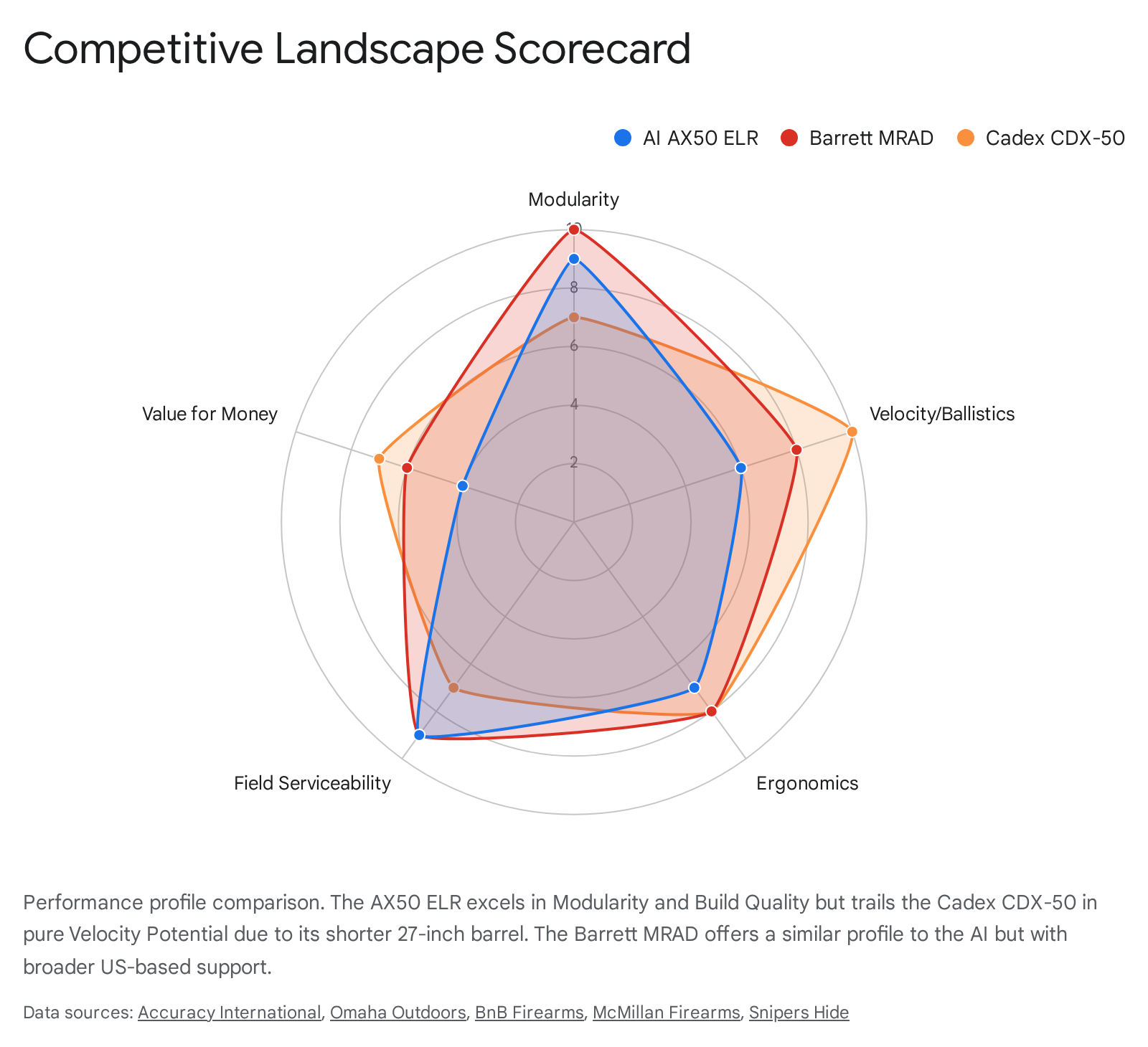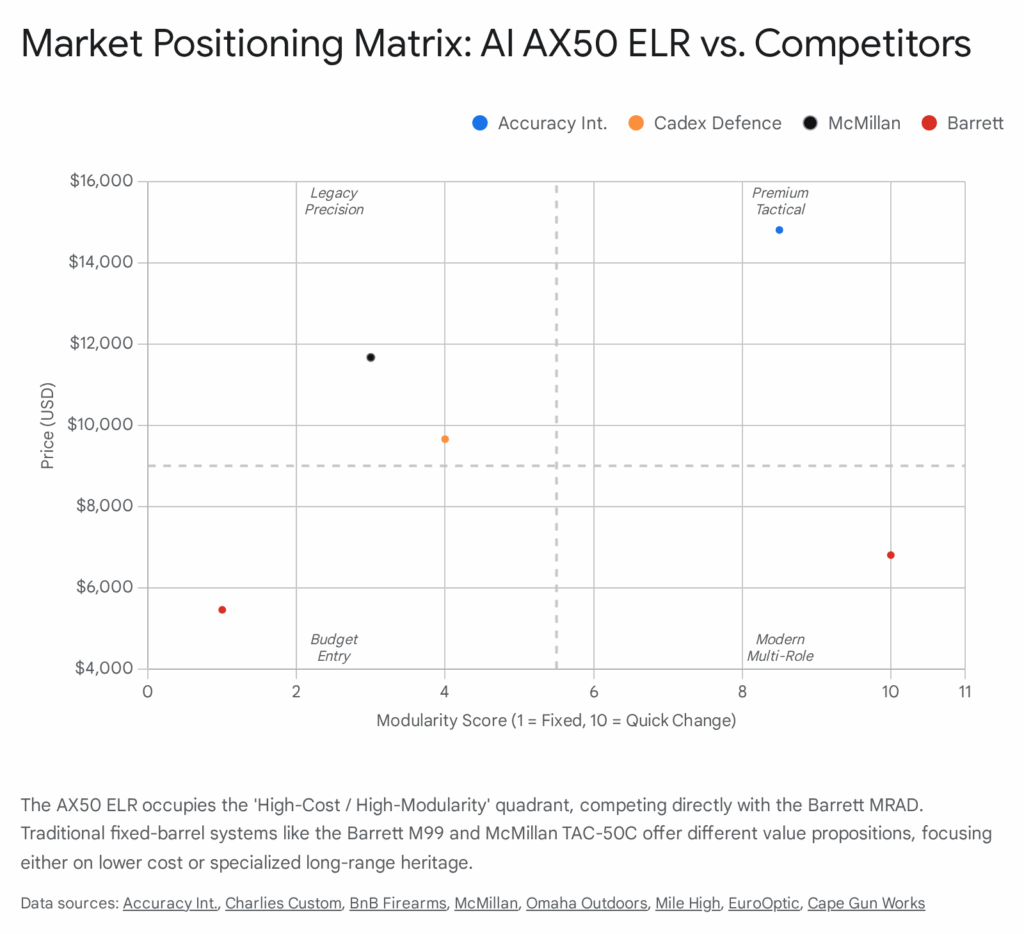 Market positioning data places the AX50 ELR in the ultra-premium segment, with a retail price point of approximately $14,809. It faces fierce competition from the Barrett MRAD, which offers similar modularity with broader military adoption, and the Cadex CDX-50 Tremor, which offers superior factory ballistic options for dedicated long-range shooters at a lower price point.