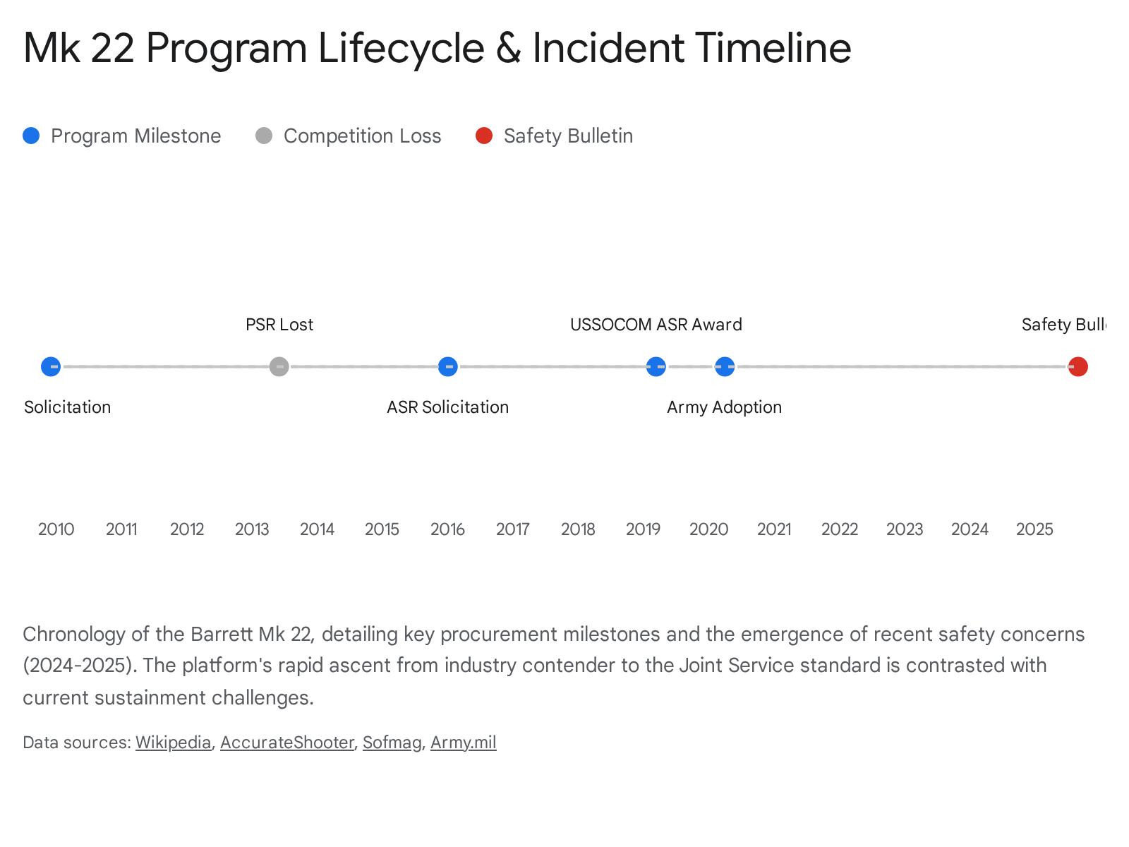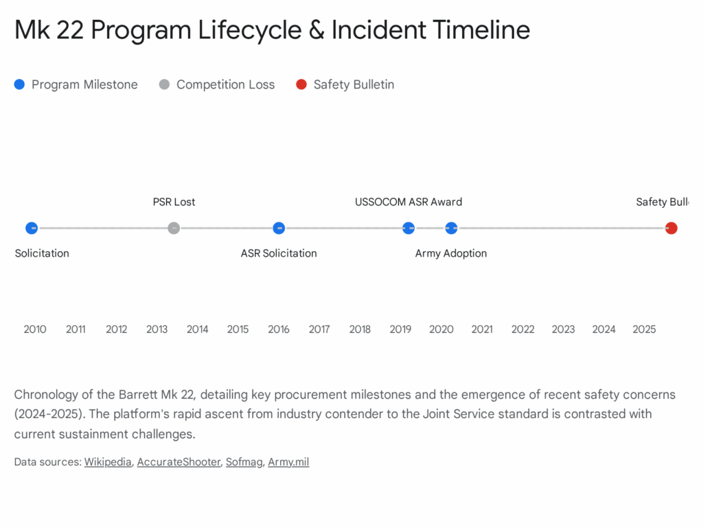 - Open Source Intelligence (OSINT): We analyzed publicly available military solicitations (USSOCOM ASR, Army PSR), contract award notices from the Department of Defense, and press releases from Barrett Firearms Manufacturing.1