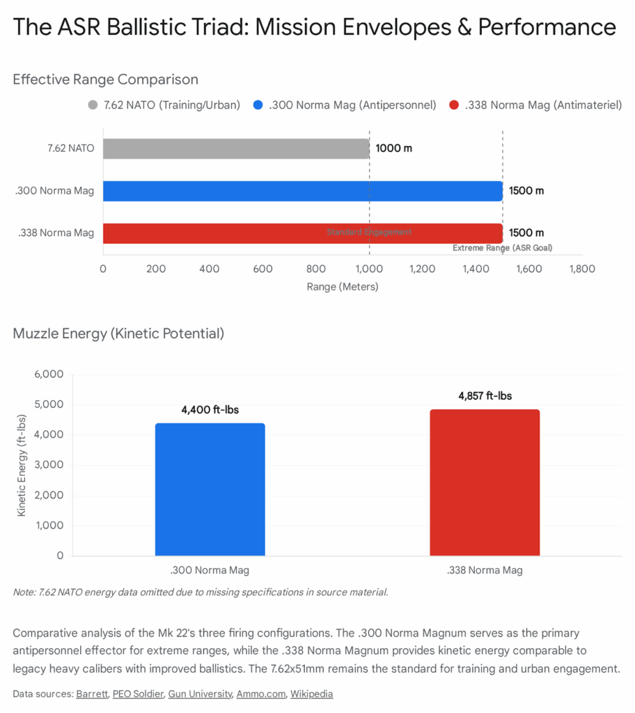 The analysis confirms that the Mk 22 represents a significant leap in lethality and logistical flexibility. By consolidating the capabilities of the legacy M2010 Enhanced Sniper Rifle (.300 Winchester Magnum) and the M107 Long Range Sniper Rifle (.50 BMG) into a single, man-portable chassis, the Department of Defense has achieved a long-sought objective: the “one gun, one operator” concept. The platform’s modular architecture allows for user-level caliber conversion between 7.62x51mm NATO,.300 Norma Magnum, and.338 Norma Magnum, effectively spanning the operational envelope from urban close-quarters training to extreme-range anti-materiel interdiction out to 1,500 meters and beyond.
