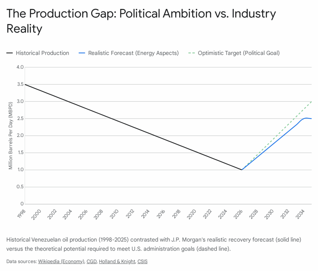 Major oil companies, including ExxonMobil, have signaled that the country remains “uninvestable” in the short term. CEO Darren Woods explicitly stated that the heavy, sour nature of Venezuelan crude, combined with the degraded infrastructure, makes a quick return on investment unlikely.20 Estimates suggest that stabilizing production would require $50 billion over 15 years, while restoring it to 3 million bpd would cost nearly $180 billion.5