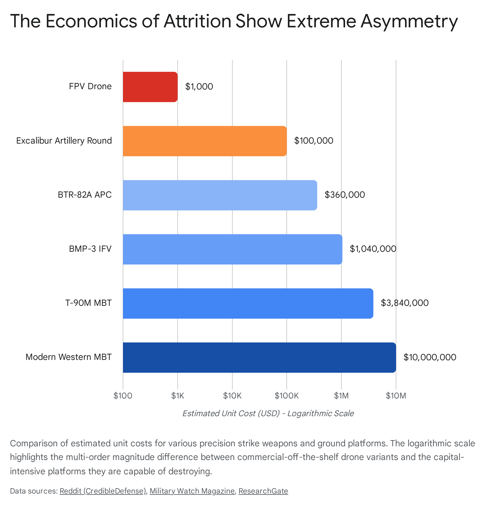 The stark contrast in unit costs defines the current attrition dynamics. A standard First-Person View drone customized for lethal payload delivery ranges in price from $300 to $1,500.6 In contrast, the targets they seek to destroy are capital-intensive strategic assets. A modern infantry fighting vehicle costs between $3 million and $4 million, while a main battle tank ranges from $2 million for older, upgraded models to over $10 million for the latest Western variants.6