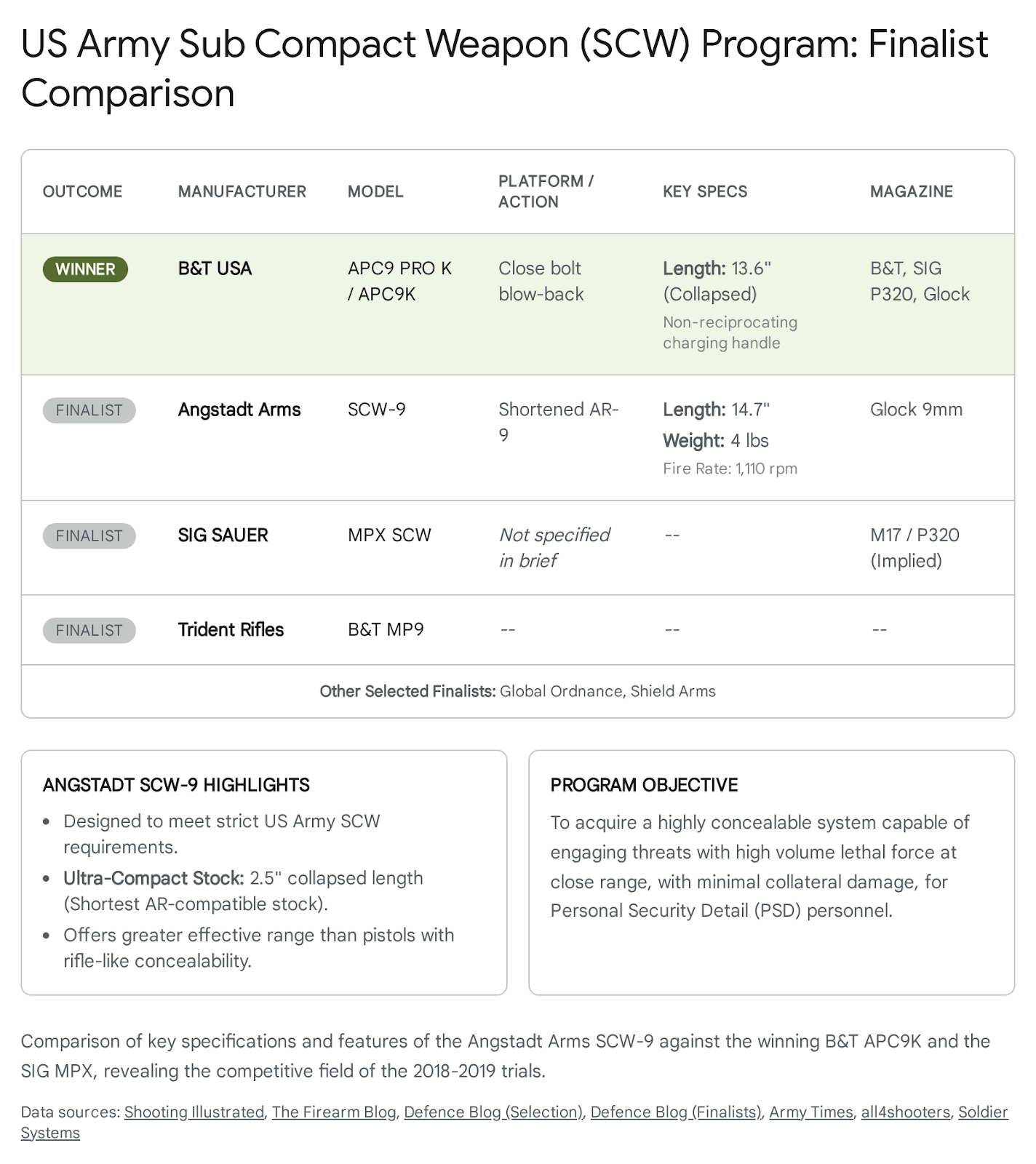 | 2018 | US Army SCW Selection | Angstadt Arms is selected as one of six finalists for the US Army’s Sub Compact Weapon (SCW) program, competing against SIG SAUER, B&T, and Global Ordnance.5 |