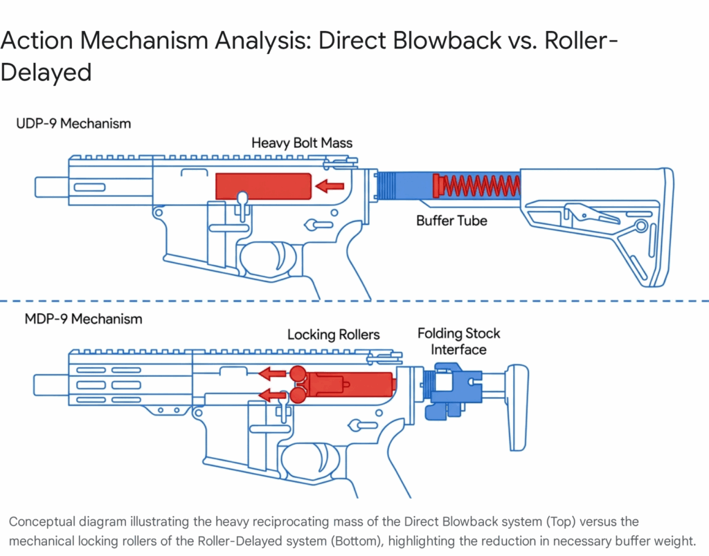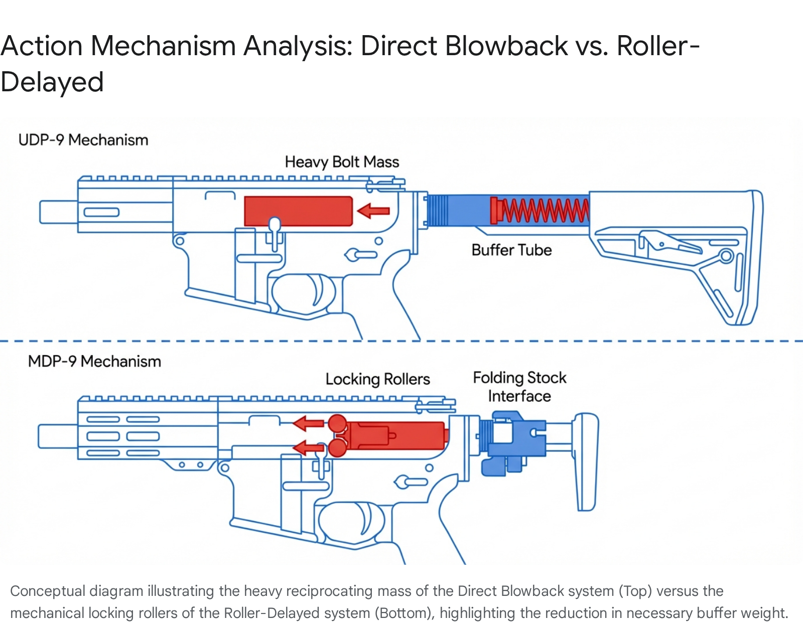 The UDP-9 utilizes a Simple Direct Blowback system. In this configuration, the breech is not mechanically locked at the moment of firing. Instead, the mass of the bolt carrier group (BCG) and the resistance of the buffer spring are the only forces keeping the cartridge case in the chamber. When the round is fired, the expanding gases push the bullet forward and the casing backward simultaneously. The heavy bolt’s inertia delays the opening of the breech long enough for pressures to drop to safe levels.