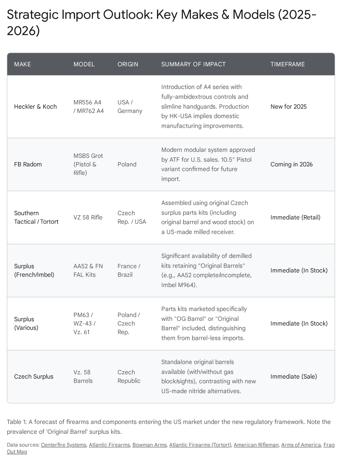 This report provides an exhaustive analysis of Ruling 2025-1, dissecting its legal mechanics, its immediate operational impact on importers, and the downstream effects on the U.S. consumer market. We project a “Surplus Renaissance” through late 2025 and 2026, characterized by the return of affordable, high-quality parts kits and a shift in domestic manufacturing priorities. Furthermore, we identify specific makes and models—from Cold War relics to modern tactical platforms like the FB Radom MSBS Grot and HK MR556 A4—that are poised to define the next fiscal year.