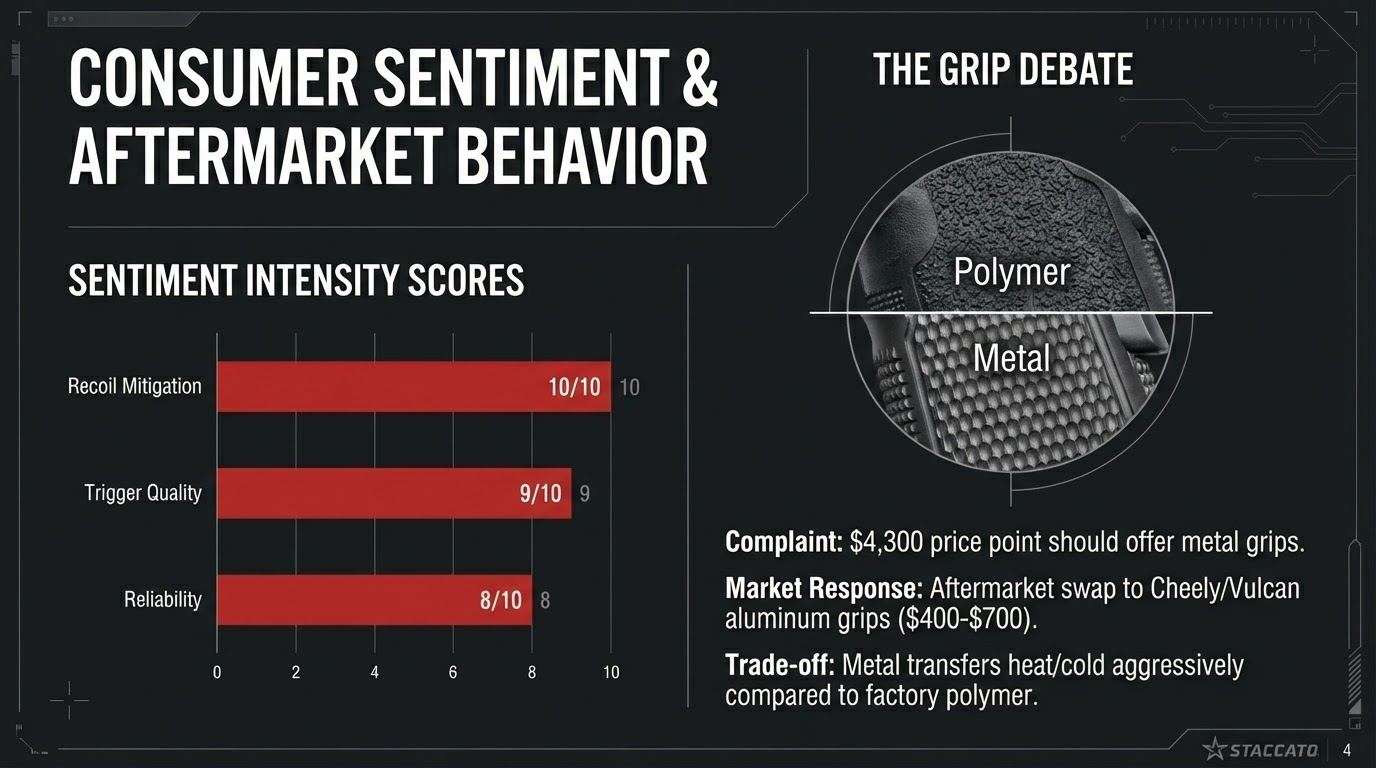 - Negative/Friction Indicators (Detractors): Reports of physical mechanical failures (Failure to Extract/Failure to Feed), complaints regarding proprietary ecosystem lock-in (e.g., magazine incompatibility with standard STI patterns), availability/supply chain stock issues, and accelerated component wear (e.g., trigger mechanism failure on striker-fired models).