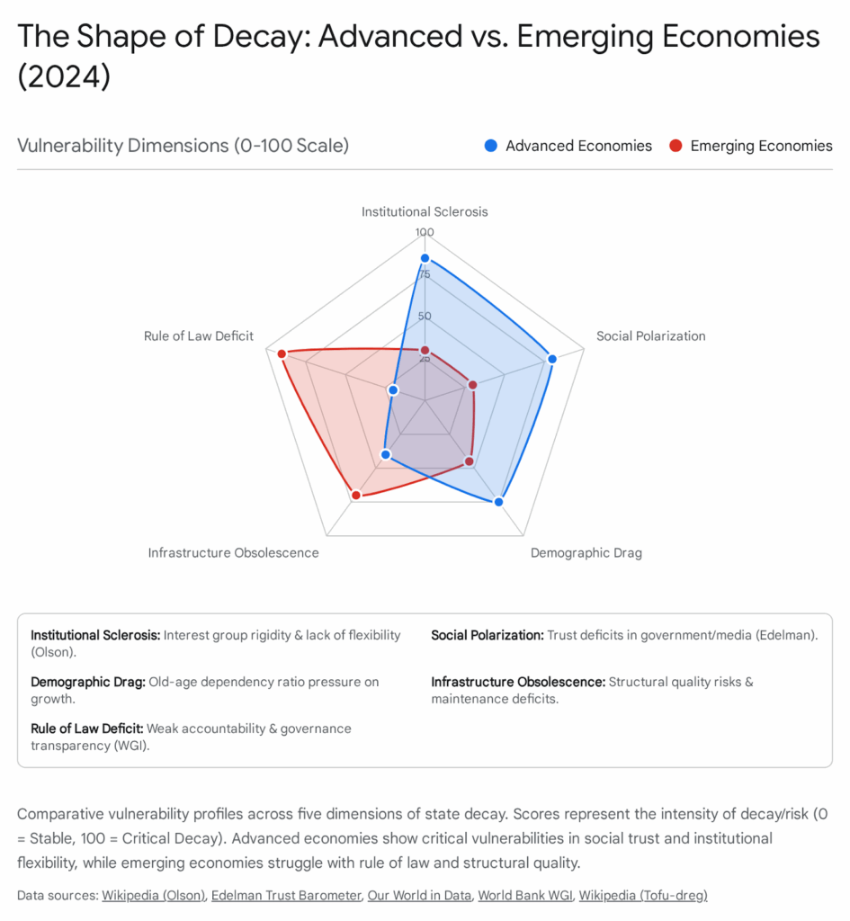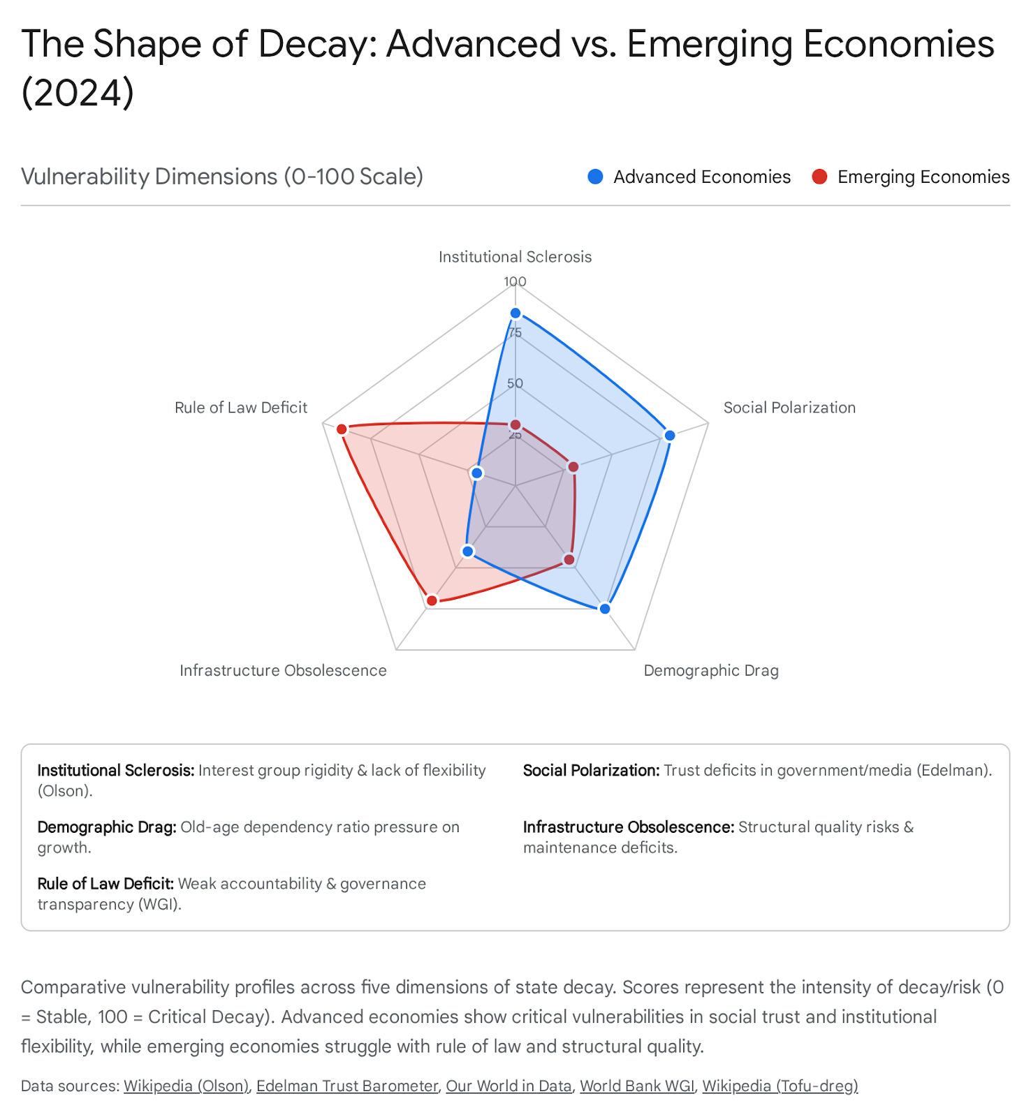 The central conclusion of this analysis is that Advanced Economies are currently decaying at a faster rate relative to their own historical baselines than Emerging Economies. This is primarily driven by “institutional sclerosis,” a phenomenon where entrenched distributional coalitions stifle adaptation, and by an unprecedented collapse in social trust. While Emerging Economies face acute volatility, structural brittleness, and “growing pains,” Advanced Economies are suffering from a systemic, degenerative stagnation that is harder to reverse due to the complexity of their established regulatory and legal frameworks.