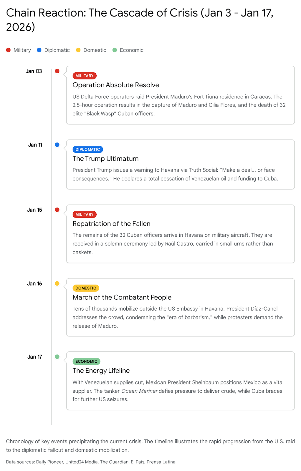 The geopolitical architecture of the Western Hemisphere has undergone a radical and potentially irreversible transformation in the second week of January 2026. Following the United States military’s Operation Absolute Resolve—the kinetic extraction of Venezuelan President Nicolás Maduro and the neutralization of his executive security apparatus on January 3—the Republic of Cuba finds itself navigating the most precarious existential crisis since the collapse of the Soviet Union. This report, generated by a joint task force of foreign affairs, military, and intelligence analysts, provides an exhaustive reconstruction and strategic assessment of the events transpiring between January 11 and January 17, 2026.