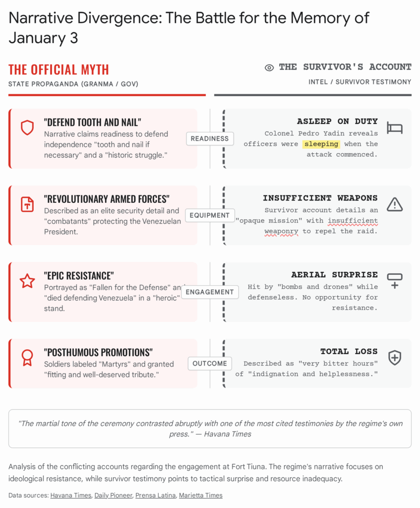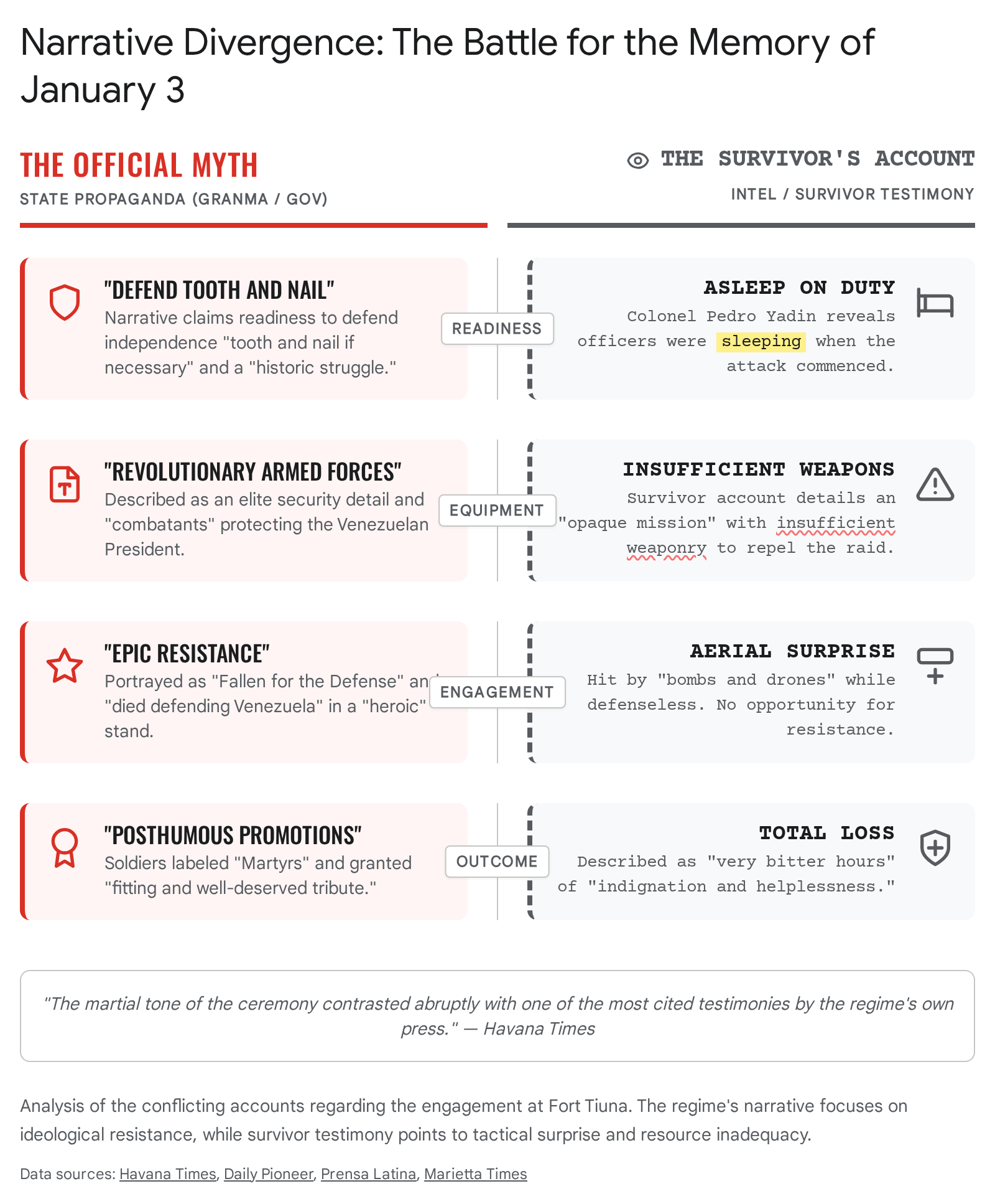 A critical development during the week of January 11–17 was the unraveling of the Cuban government’s official narrative regarding the battle at Fort Tiuna. The regime, seeking to salvage morale, constructed a narrative of “epic resistance.” President Miguel Díaz-Canel and state media outlets asserted that the officers “fought to the last bullet,” framing their deaths as a heroic sacrifice in the anti-imperialist struggle.3 This narrative was essential to justify the loss of life in a foreign war to a domestic audience already weary of shortages.