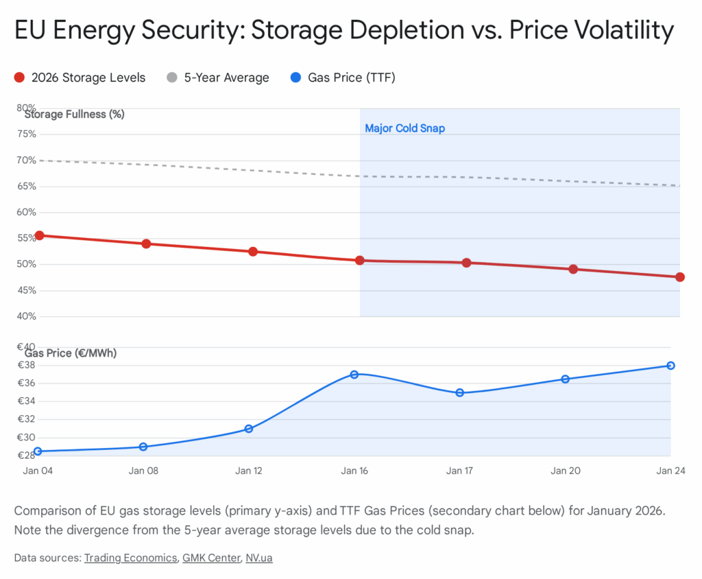 Storage Depletion: Gas storage levels have fallen to approximately 50%, significantly below the 58-60% levels seen at this time in previous years. The depletion rate is accelerating due to the severe cold snap and the need to export electricity to Ukraine.37