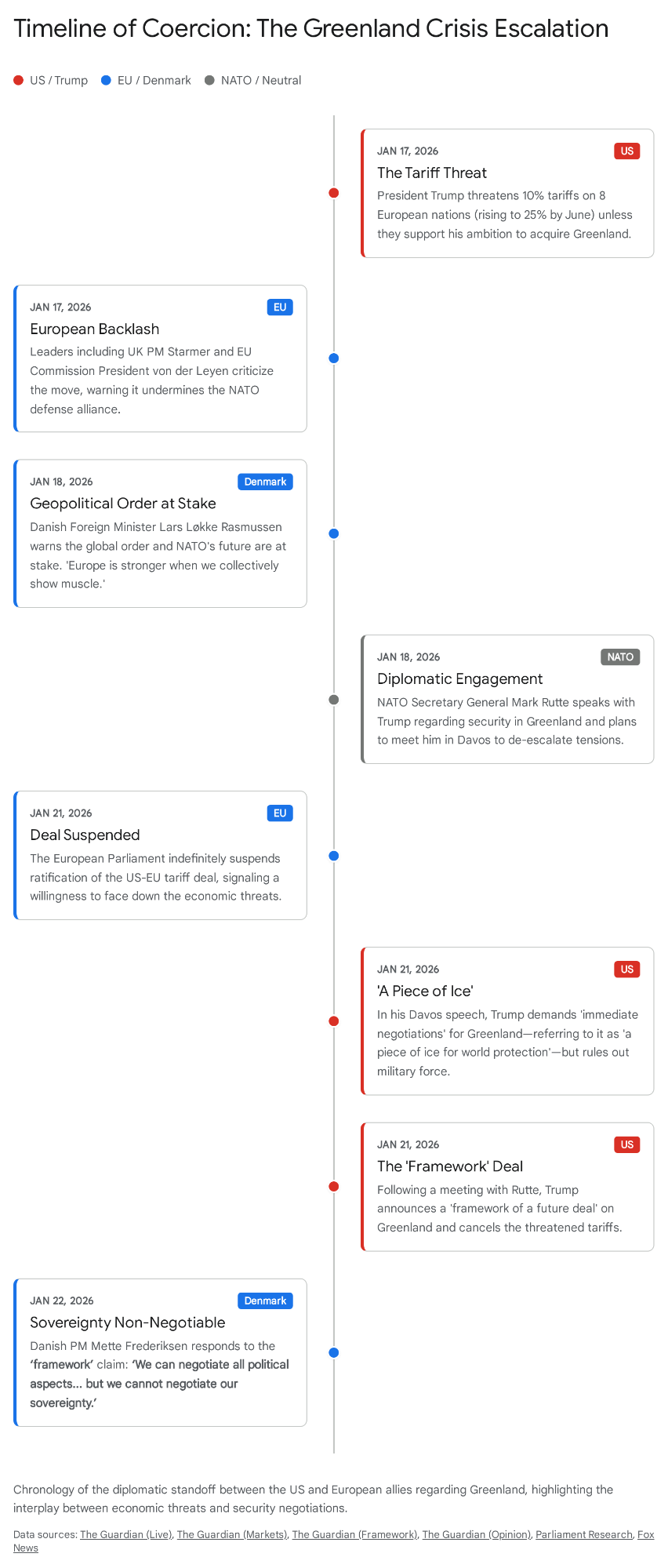 The reporting period was dominated by a geopolitical shockwave initiated by the United States regarding the status of Greenland. This event, now referred to in diplomatic circles as the “Greenland Crisis,” represents a paradigm shift in transatlantic relations, characterized by the weaponization of economic policy against NATO allies to achieve territorial security objectives.