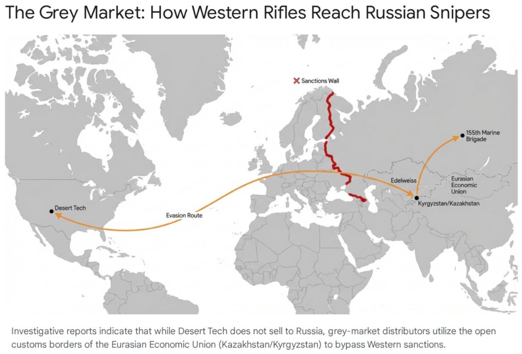 The mechanism of this acquisition highlights the complexity of modern sanctions enforcement. Since direct export to Russia is banned, Russian procurement networks utilized intermediaries in Central Asia. The report detailed a supply chain where rifles were legally exported from the U.S. to distributors in Kyrgyzstan and Kazakhstan—members of the Eurasian Economic Union (EAEU).33 Once inside the EAEU customs union, goods can flow freely across borders. Companies like “Edelweiss” in Kyrgyzstan would import the rifles as civilian hunting weapons, after which they were re-exported or transshipped to Russian military buyers.33