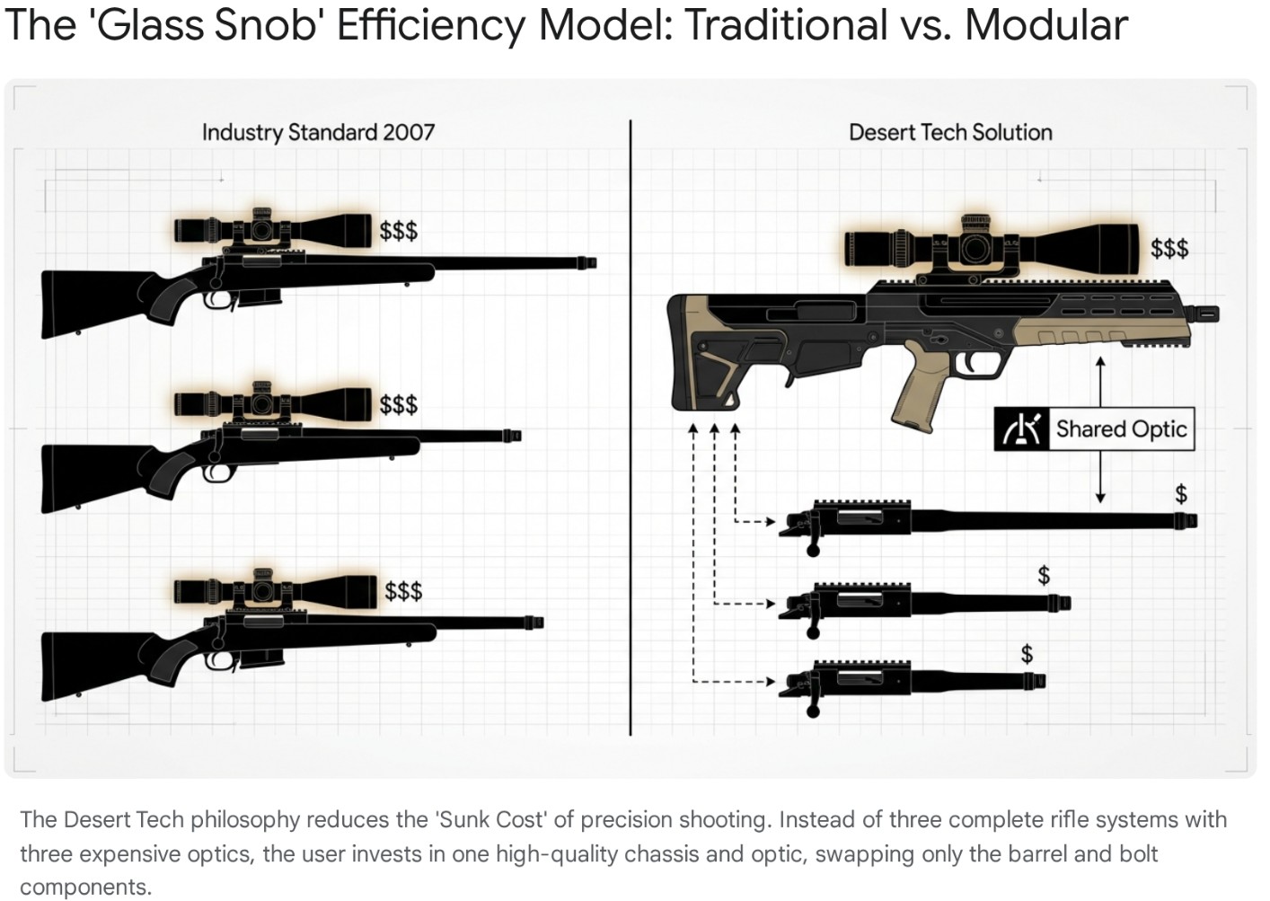 Young’s design philosophy was shaped by his self-identification as a “glass snob”—a shooter who prioritized high-end optics but lacked the funds to equip multiple rifles with top-tier scopes.2 In 2007, a premium tactical scope (such as a Schmidt & Bender or US Optics) could easily cost $3,000 to $4,000, often exceeding the cost of the rifle itself. Young realized that the most efficient way to access multiple calibers was not to buy more rifles, but to build a single, modular chassis that could swap calibers while retaining the same optic, trigger, and ergonomics.2