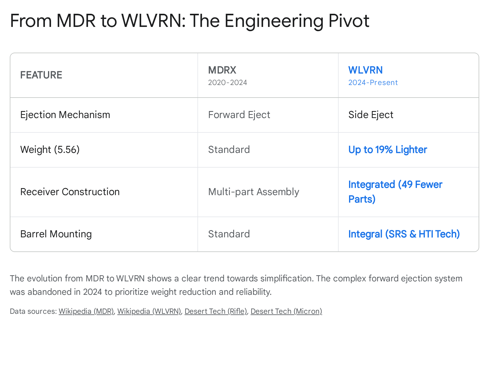In January 2024, Desert Tech officially discontinued the MDR and MDRX lines, replacing them with the WLVRN (Wolverine).5 The WLVRN represents a triumph of pragmatism over ambition. It completely abandons the complex forward-ejection mechanism that defined the MDR. By reverting to a simpler side-ejection system (borrowing from the SRS barrel mounting architecture), the engineers achieved significant performance gains: