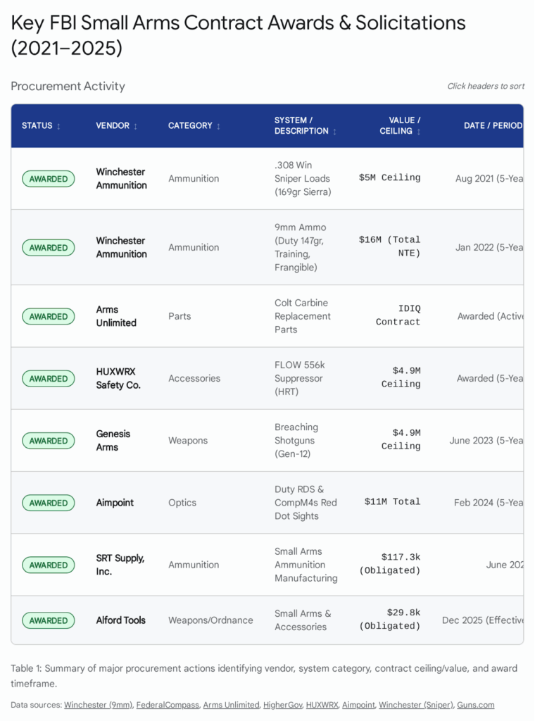 The following summary details the critical small arms contracts and solicitations identified during the 2021–2025 analysis period.