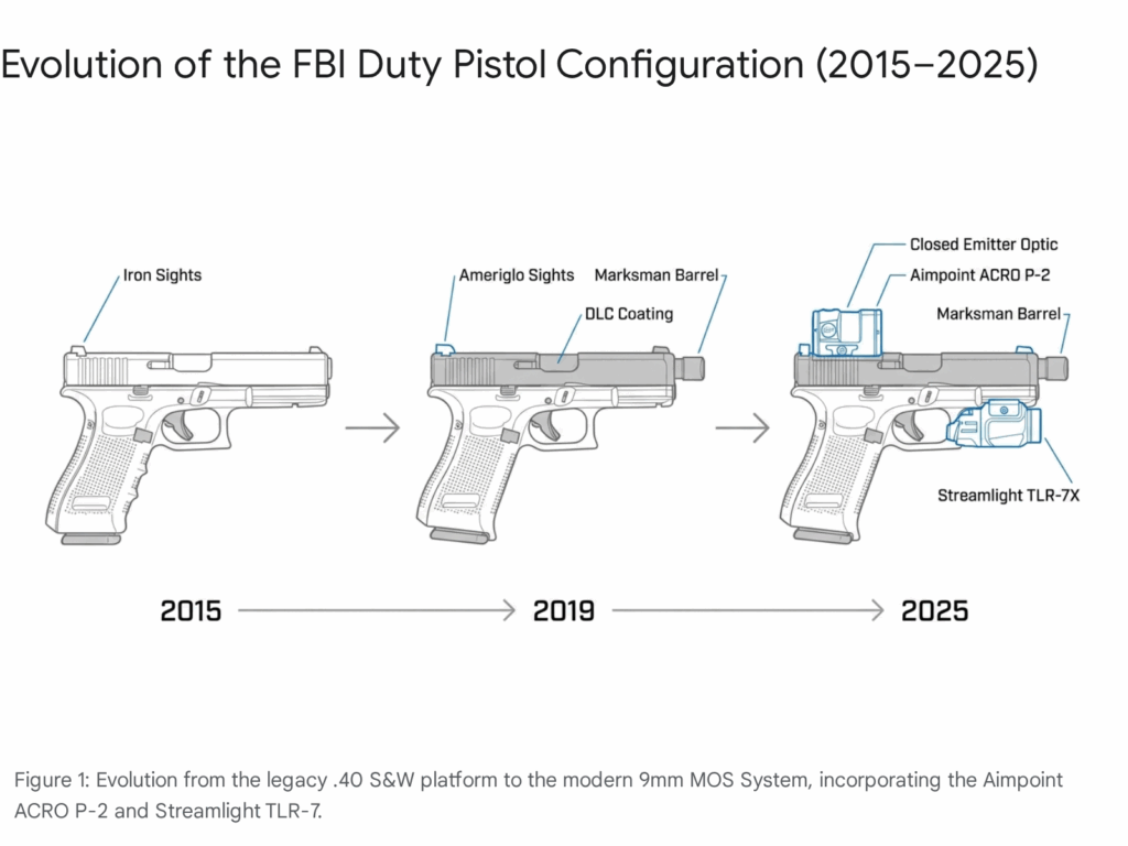 The Federal Bureau of Investigation’s transition to the 9mm Luger cartridge, initiated in the mid-2010s, reached full maturity during the 2021–2025 reporting period. This era marks the definitive end of the.40 S&W primacy within federal law enforcement, a caliber originally championed by the Bureau itself following the 1986 Miami shootout. The current pistol ecosystem is built entirely around the Glock “M” series architecture, a platform that has evolved from a simple sidearm into a sophisticated, optic-enhanced weapon system.