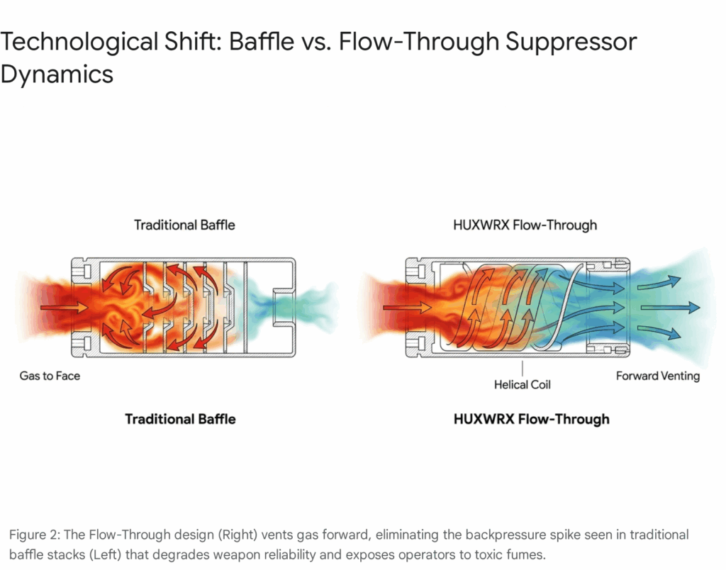 Perhaps the most significant technological leap in the rifle sector is the adoption of flow-through suppressors. In 2022/2023, the FBI awarded a $4.9 million contract to HUXWRX Safety Co. (formerly OSS) for the FLOW 556k suppressor.20 This award followed a comprehensive test by the Ballistic Research Facility where the HUXWRX design outperformed competitors in weight, flash reduction, sound suppression, and gas blowback.