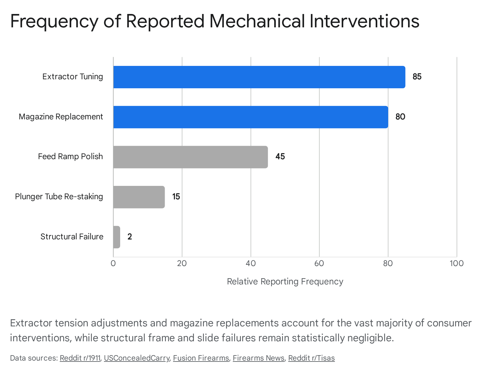 To ensure uncompromising accuracy, the analysis employed a strict Signal versus Noise filtering mechanism. Statements exhibiting extreme brand loyalty or hyperbolic disparagement (such as blanket statements declaring the brand flawless, or conversely, declaring it inherently inferior solely due to its country of origin) were immediately discarded. Anomalous, unrepeated breakages were logged in the raw data but omitted from the primary findings to prevent skewing the median reliability assessment. Conversely, when multiple, completely independent users across separated digital platforms documented identical, recurring issues regarding extractor tension requirements, factory magazine geometry failures, and specific hollow point binding incidents, these anomalies were immediately elevated and classified as verified mechanical realities.