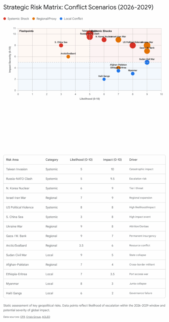 The following analysis identifies areas where conflict is likely to erupt or significantly escalate over the next three years. These assessments are based on current trend lines, intelligence signaling, and structural geopolitical shifts.
