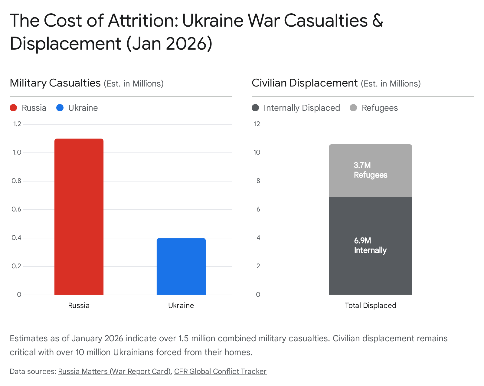 The human cost of this strategic stalemate has reached proportions unseen in Europe since the Second World War. Intelligence estimates released in early 2026 place Russian casualties (killed and wounded) at approximately 1.1 million.4 This figure reflects the Russian command’s reliance on mass-infantry assaults to fix Ukrainian defenders, absorbing catastrophic losses to achieve incremental gains. On the Ukrainian side, casualties are estimated at 400,000 4, a toll that has severely strained the nation’s mobilization potential and social cohesion.