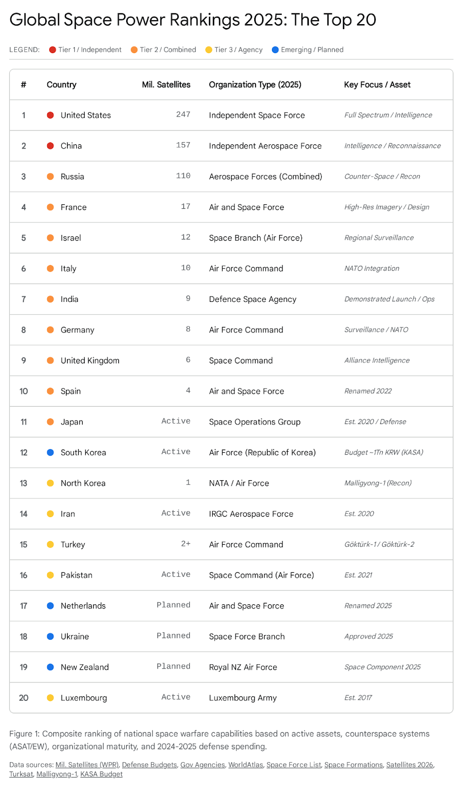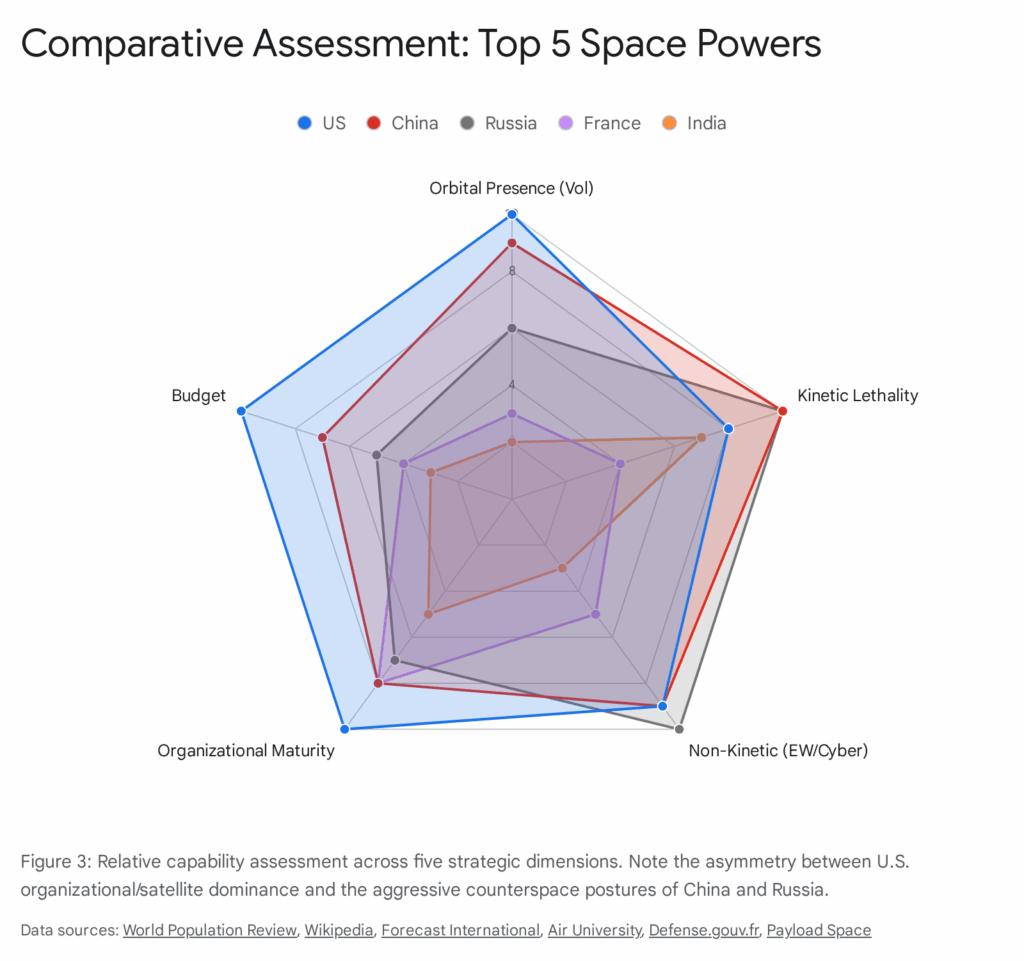 • Organizational Maturity (15%): Presence of a dedicated Space Command/Force and articulated military doctrine.