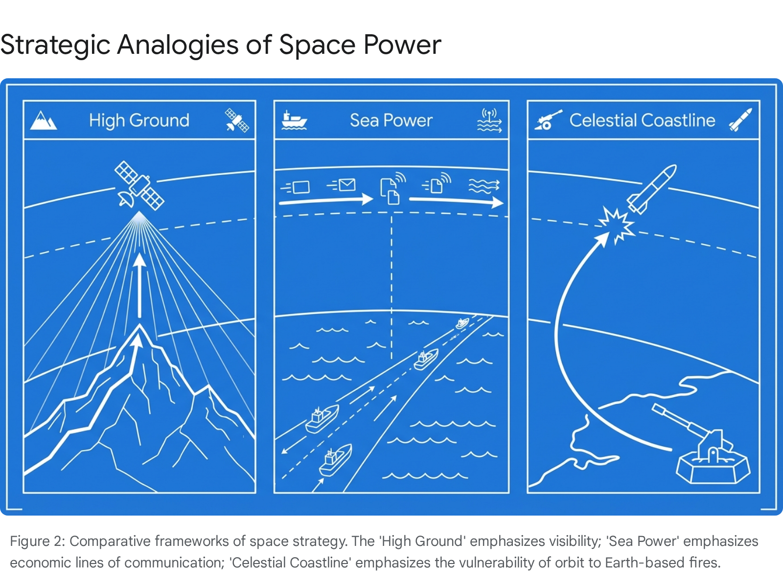 A more sophisticated analogy is the “Coastal” or “Littoral” analogy.8 Space is not a distant ocean but a coastline immediately adjacent to Earth. Events in space have immediate, tactical effects on the ground. Just as coastal artillery can deny the use of the sea to a navy, Earth-based ASATs (missiles, lasers) can deny the use of space to satellites. This implies that space warfare will not just be “satellite vs. satellite” (dogfights) but “Earth vs. space” (surface-to-air fires).