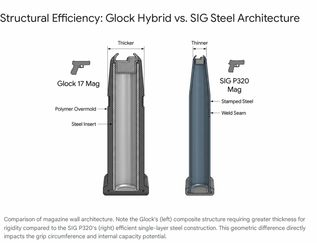 The divergence in performance between the Glock 17 and SIG P320 magazines is rooted in their foundational architectural choices. The selection of materials—polymer composite versus stamped carbon steel—dictates every subsequent performance characteristic, including wall thickness, internal friction coefficients, thermal conductivity, and impact response behavior.