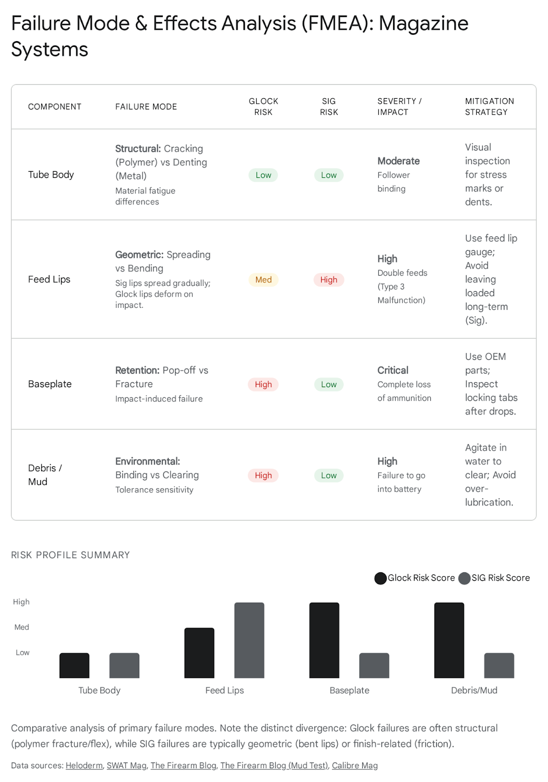 Ultimately, the analysis concludes that for pure engineering performance regarding feed geometry and stiffness, the SIG P320 magazine is the superior mechanical device. However, as a systemic service component, the Glock 17 magazine offers a more robust balance of durability, cost-effectiveness, and logistical reliability.