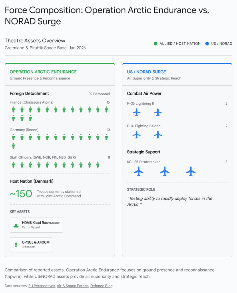 • Strategic Intent: The deployment of fewer than 200 total personnel was militarily insufficient to repel a resolute U.S. intervention. However, it functioned effectively as a “tripwire.” Any U.S. military move to seize airfields or ports would necessitate confronting not just Danish personnel, but troops from the UK, France, and Germany, thereby invoking a wider diplomatic crisis that the White House could not easily contain.4 The operation signaled that the defense of Greenland was not merely a Danish concern, but a pan-European imperative.25