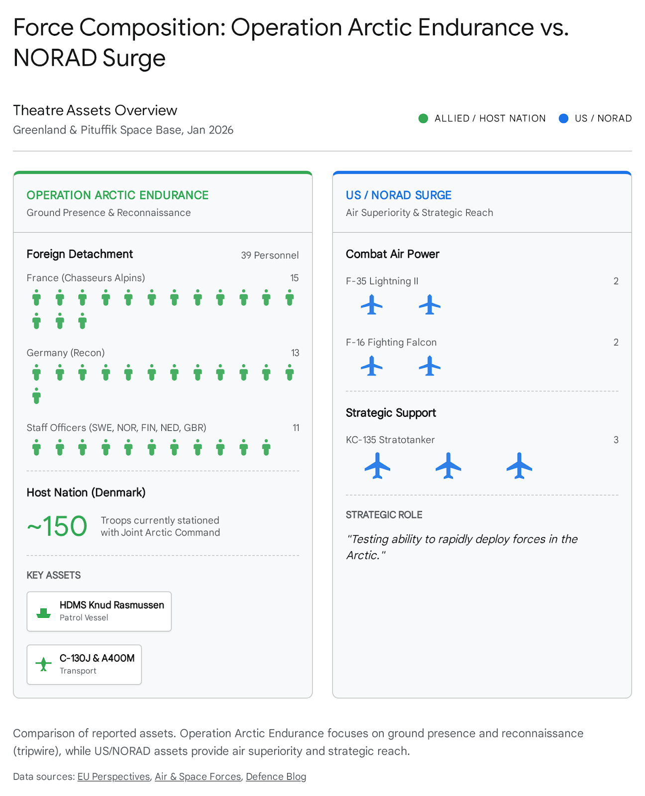 • Strategic Intent: The deployment of fewer than 200 total personnel was militarily insufficient to repel a resolute U.S. intervention. However, it functioned effectively as a “tripwire.” Any U.S. military move to seize airfields or ports would necessitate confronting not just Danish personnel, but troops from the UK, France, and Germany, thereby invoking a wider diplomatic crisis that the White House could not easily contain.4 The operation signaled that the defense of Greenland was not merely a Danish concern, but a pan-European imperative.25