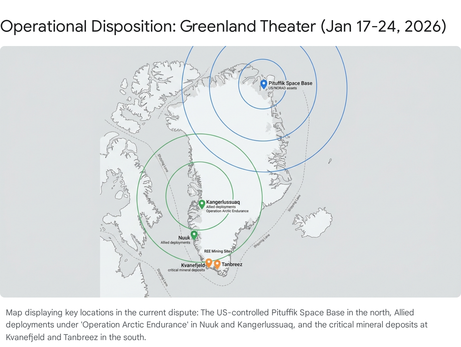 In a historic display of European solidarity, the targeted nations executed “Operation Arctic Endurance,” a multinational military deployment to Greenland designed to reinforce Danish sovereignty through physical presence.4 This maneuver created a physical “tripwire” in Nuuk and Kangerlussuaq, effectively raising the geopolitical cost of any unilateral U.S. action. The juxtaposition of U.S. North American Aerospace Defense Command (NORAD) assets surging to Pituffik Space Base alongside European mountain infantry deploying to civilian airfields created a highly congested and high-stakes operating environment.6