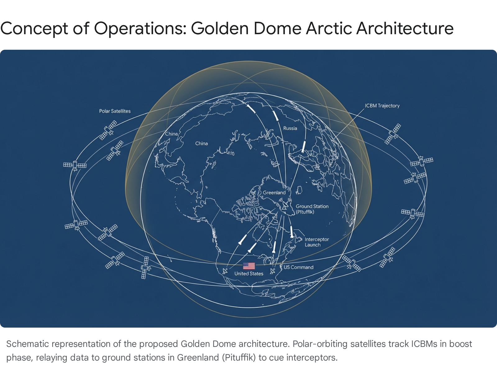 • Boost-Phase Intercept: Unlike current mid-course defense systems (GMD) which target warheads in space, the Golden Dome prioritizes “boost-phase” intercept—neutralizing missiles while their engines are still burning and they are most vulnerable. This requires sensors and interceptors to be positioned as close to the threat launch vectors as possible.31