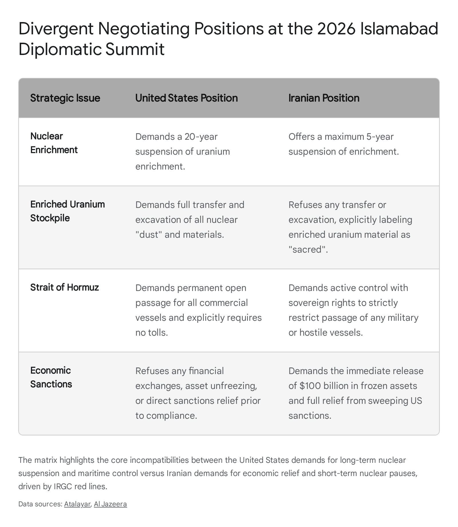 During the Islamabad talks, the United States presented demands including a 20-year suspension of uranium enrichment, whereas the Iranian delegation offered a maximum suspension of five years.5 Tehran continues to aggressively reject claims that it will surrender its enriched uranium stockpiles, with Foreign Ministry spokespersons declaring the material sacred and unequivocally not open for discussion.8 Analysts note that Iran requires substantial economic inducements to justify any concessions, such as the immediate release of 100 billion USD in frozen assets and comprehensive sanctions relief, which the United States is currently unwilling to provide without total capitulation.8 Consequently, the talks concluded after 21 hours without an agreement, leading to a resumption of hostilities.26