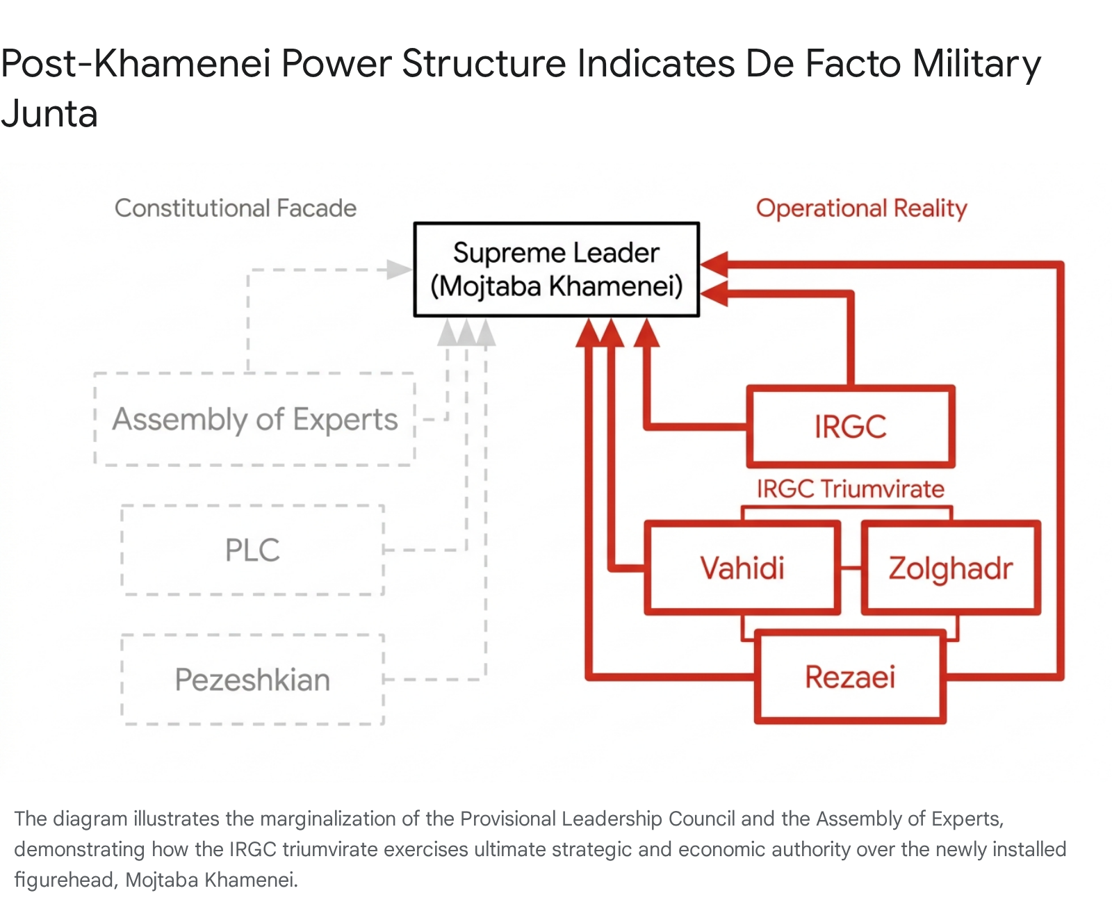 The sudden vacuum at the apex of the Iranian political structure has exposed the extreme fragility of the regime’s institutional equilibrium. For over three decades, Ali Khamenei maintained stability by balancing competing clerical, bureaucratic, and military factions, ensuring that no single entity could challenge his supreme authority.3 His death has replaced this carefully managed, competitive oligarchy with naked institutional survivalism, leading to the complete marginalization of civilian governance.