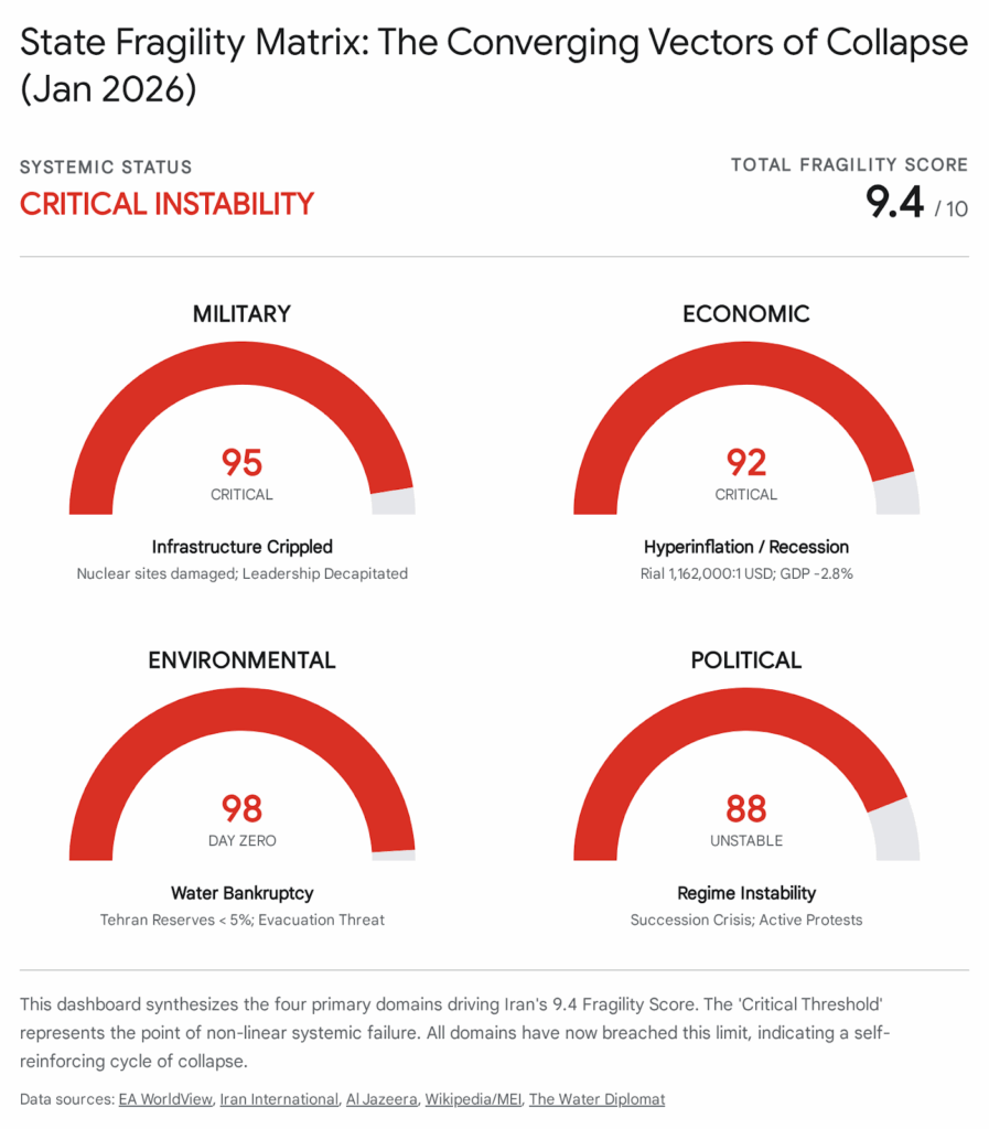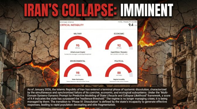 As of January 2026, the Islamic Republic of Iran has entered a terminal phase of systemic dissolution, characterized by the simultaneous and synchronized failure of its coercive, economic, and ecological subsystems. Under the “Multi-Domain Systems-Dynamic Prompt for Predictive Modeling of State Lifecycle and Collapse Likelihood” framework, a score of 9.4 indicates that the state has surpassed the “resilience threshold” where internal feedback loops (reform, repression, or co-optation) can restore equilibrium. The regime is no longer managing crises; it is being managed by them. The transition to “Phase IV: Dissolution” is defined not merely by the presence of threats, but by the state’s incapacity to generate effective responses to those threats, leading to a rapid decoupling of the population from the state apparatus and the fragmentation of the elite cohesion that has historically ensured regime survival.
