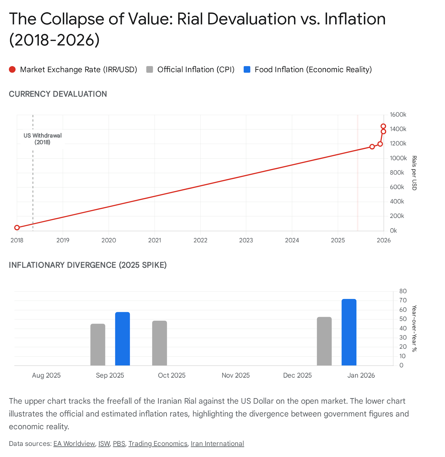 The most visible symptom of the economic collapse is the obliteration of the national currency, the Rial. As of January 2026, the currency trades on the open market at approximately 1,400,000 Rials to the U.S. Dollar. To place this in historical context, the rate was roughly 45,000 to the dollar in early 2018, before the U.S. withdrawal from the JCPOA.9 This represents not just a depreciation, but a near-total evaporation of the currency’s value. The slide has accelerated dramatically in the post-war period; in December 2025 alone, the Rial lost significant value, breaching psychological barriers daily.11