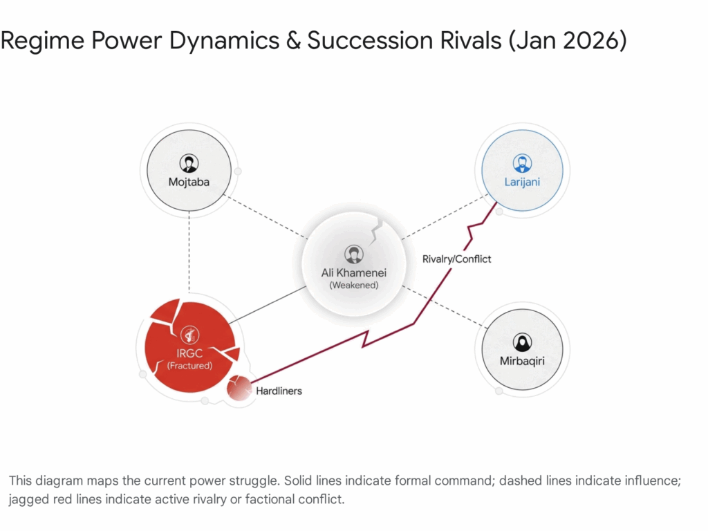 The uncertainty of the transition is destabilizing the regime from within. Factions are positioning themselves for the post-Khamenei era, hoarding resources and intelligence, leading to paralysis in decision-making at the state level.