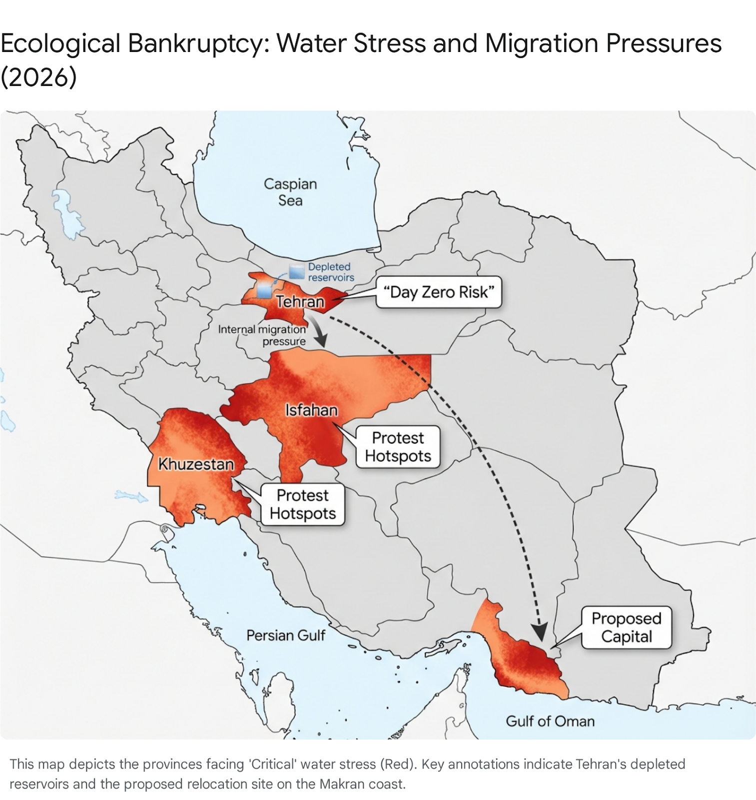 Beyond the political instability and economic ruin, Iran faces a threat that is absolute and non-negotiable: the irreversible ecological collapse of the Iranian plateau. This “water bankruptcy” is not a future projection but a present reality that is reshaping the country’s demographics and fueling its instability. The environmental subsystem has crashed, acting as a threat multiplier that exacerbates every other crisis the state faces.