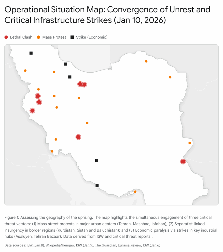 The Islamic Republic of Iran is currently navigating the most precarious existential crisis in its forty-seven-year history, a convergence of catastrophic economic failure, the geopolitical aftershocks of the “Twelve-Day War” of June 2025, and a nationwide uprising of unprecedented scope and intensity. As of January 10, 2026, the clerical regime faces a “dual-pressure” dynamic that it has successfully avoided in previous cycles of unrest: mass street mobilization coinciding with crippling labor strikes in critical economic sectors, specifically the bazaar and the hydrocarbon industry.