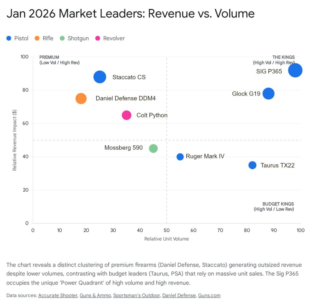 • Source A (NICS Data): We utilized the NSSF Adjusted NICS data for January 2026 to establish the Total Addressable Market (TAM) volume. The “Handgun” vs. “Long Gun” split provided category caps.69