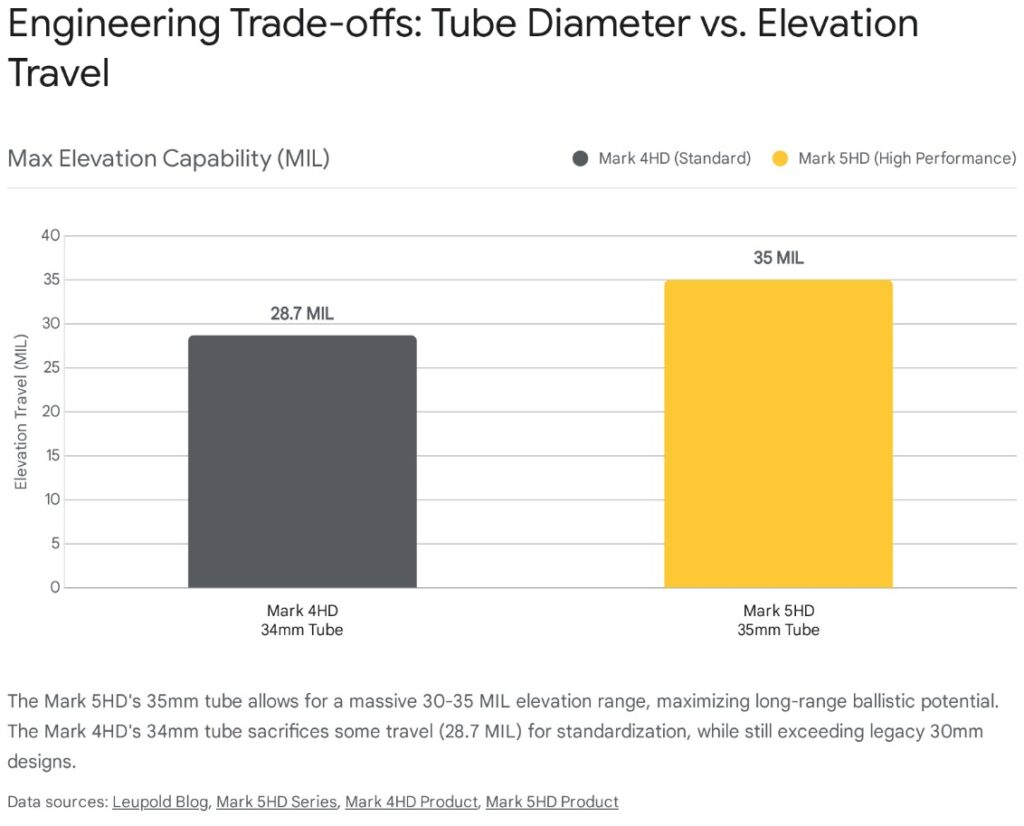 - The 35mm Isolation (Mark 5HD): In hindsight, the decision to use a 35mm tube for the Mark 5HD was a strategic error in terms of commercial adoption. While it secured military contracts by meeting weight and travel specs, it alienated the broader commercial market. Had Leupold engineered the Mark 5HD with a 34mm tube, it likely would have captured even more market share from Nightforce.