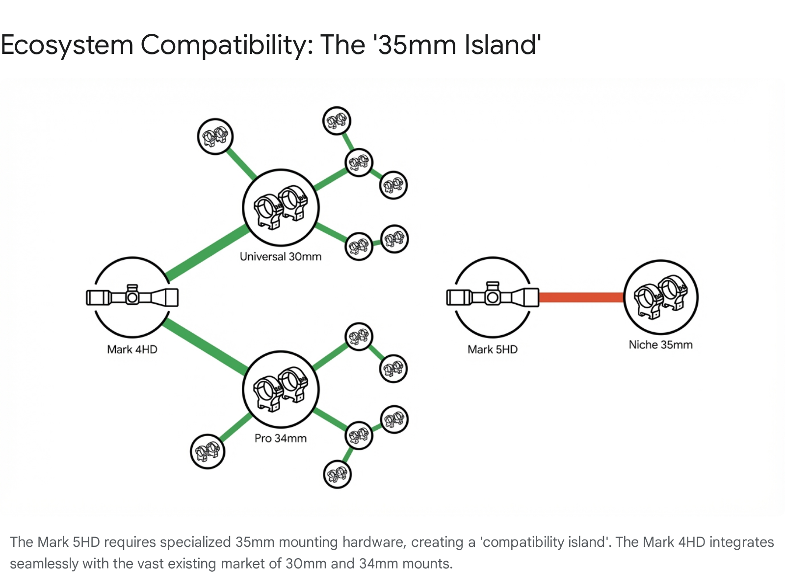 - The 35mm Isolation (Mark 5HD): In hindsight, the decision to use a 35mm tube for the Mark 5HD was a strategic error in terms of commercial adoption. While it secured military contracts by meeting weight and travel specs, it alienated the broader commercial market. Had Leupold engineered the Mark 5HD with a 34mm tube, it likely would have captured even more market share from Nightforce.