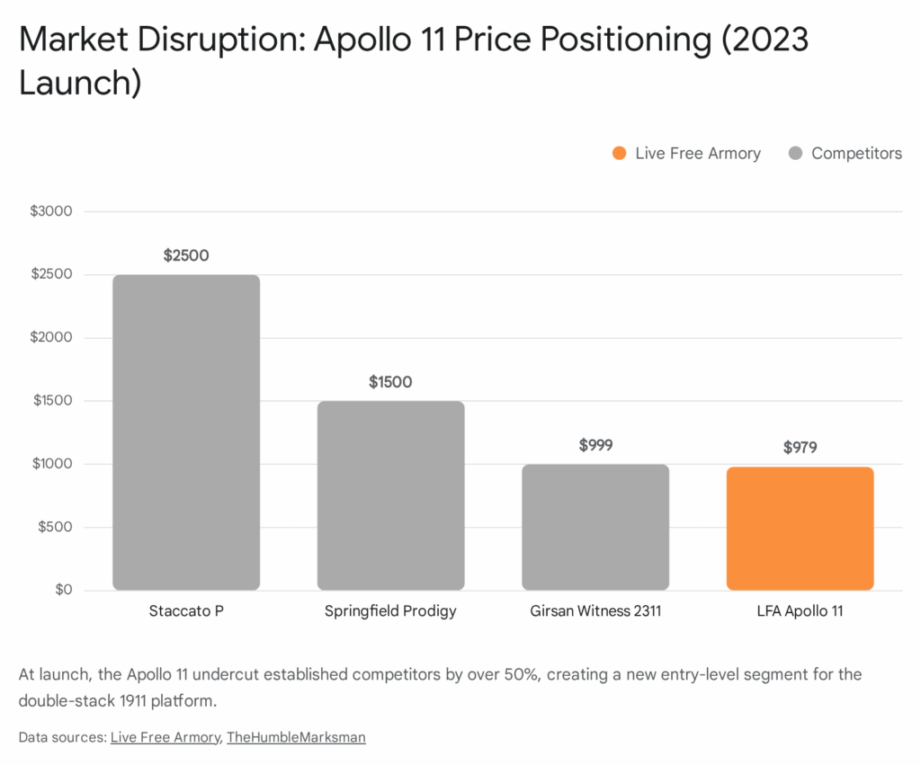 LFA’s market identity is defined by its aggressive disruption of price-to-performance ratios. Initially focusing on the AR-15 and AR-10 rifle platforms, the company pivoted in the early 2020s to address the “metal-framed” handgun segment. This strategic shift culminated in the release of the “AMP” (Aluminum Match Grade) pistol series and, most notably, the “Apollo 11” double-stack 1911 platform. The Apollo 11 challenged the established pricing hierarchy of the “2011” market, offering features traditionally reserved for boutique custom firearms—such as hand-fitted actions and match-grade bull barrels—at a sub-$1,000 price point. This move democratized a platform previously accessible only to affluent competitors, forcing legacy manufacturers to re-evaluate their value propositions.