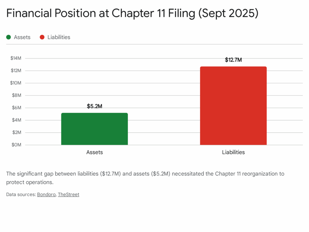 | 2025 | Chapter 11 Filing (Sep 26) | Filed for bankruptcy protection to restructure $12.7M in liabilities. Operations continued uninterrupted. | 24 |
