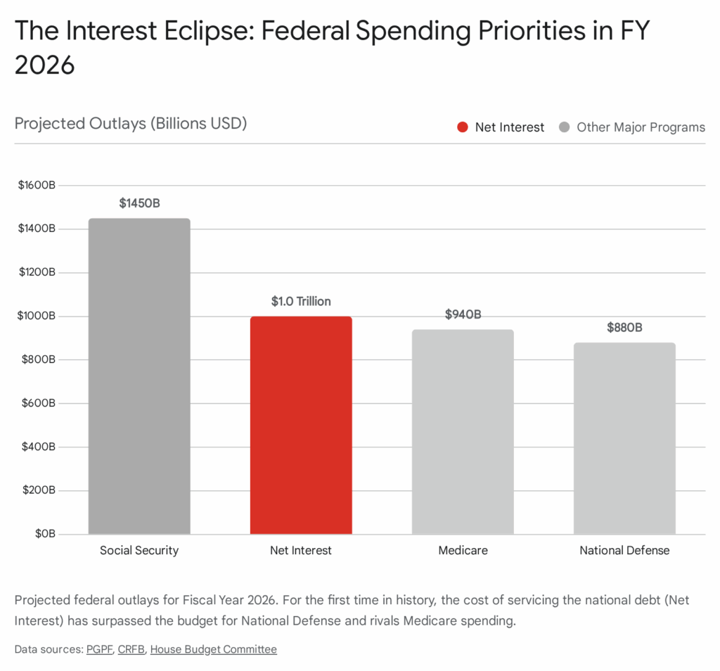 In Fiscal Year 2025, the federal government spent $970 billion on net interest payments.3 Projections for FY 2026 indicate that this figure will surpass $1 trillion for the first time in history.4