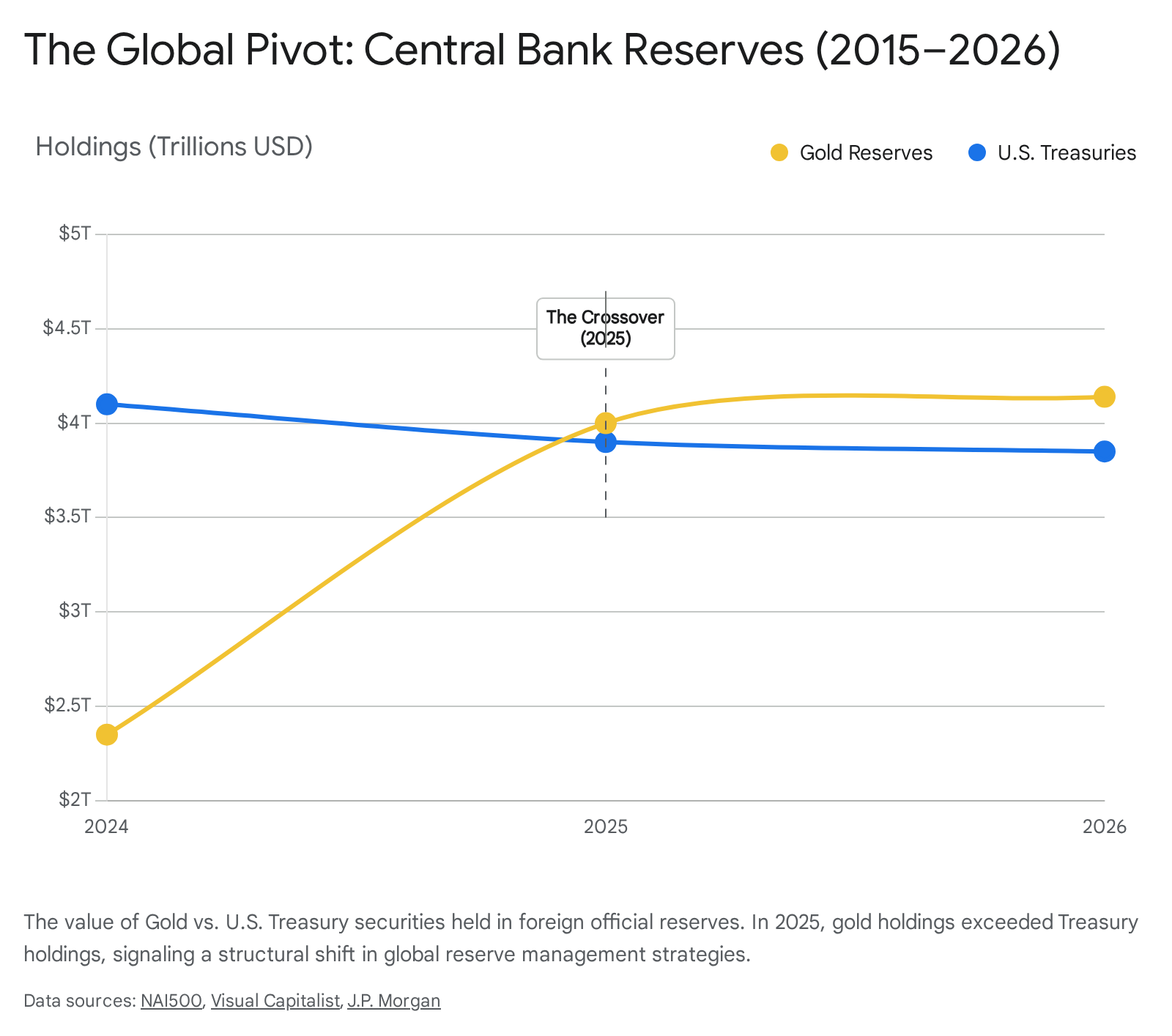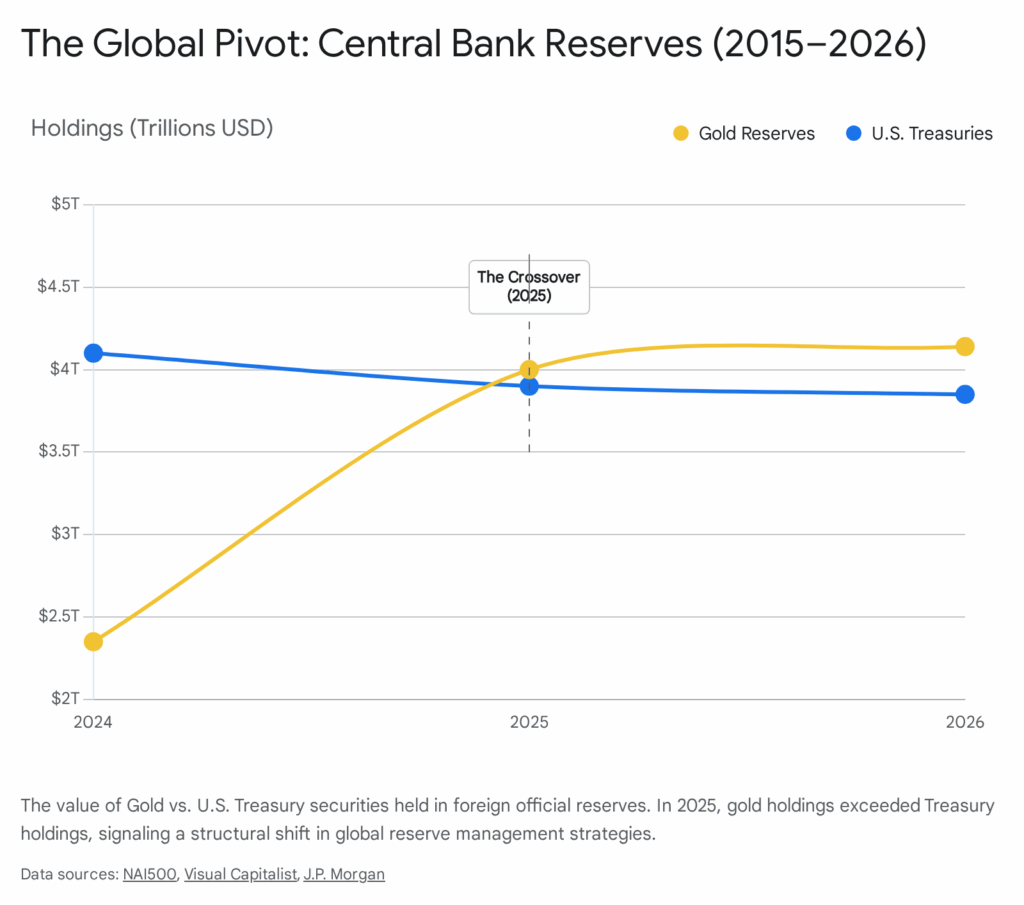 - Gold Surpasses US Treasuries to Become World’s Largest Reserve Asset, accessed January 13, 2026, https://nai500.com/blog/2026/01/gold-surpasses-us-treasuries-to-become-worlds-largest-reserve-asset/