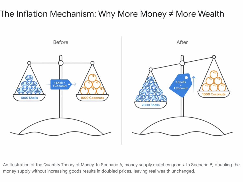 Now, suppose the island chief discovers a hidden cave containing 1,000 new shells and distributes them equally among the villagers. The villagers feel momentarily rich—their nominal wealth has doubled. They rush to the market to buy more coconuts. However, the island still only produces 1,000 coconuts. There are now 2,000 shells chasing 1,000 coconuts. The price of a coconut will inevitably rise to two shells.