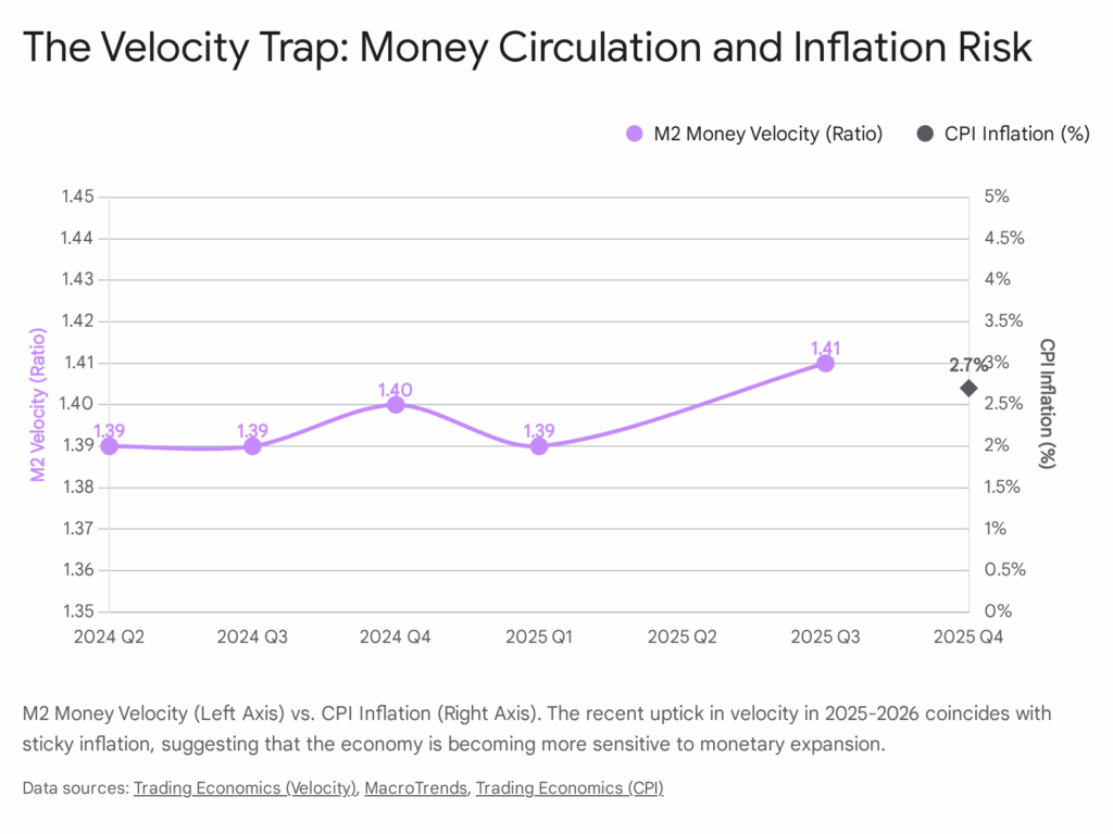 Recent data confirms this risk. M2 money velocity, which hit historic lows in 2020, has recovered to 1.406 as of late 2025.17 This uptick indicates that each dollar creates more inflationary pressure today than it did five years ago. This “Velocity Trap” means the Federal Reserve has far less room to maneuver than it did during previous crises.